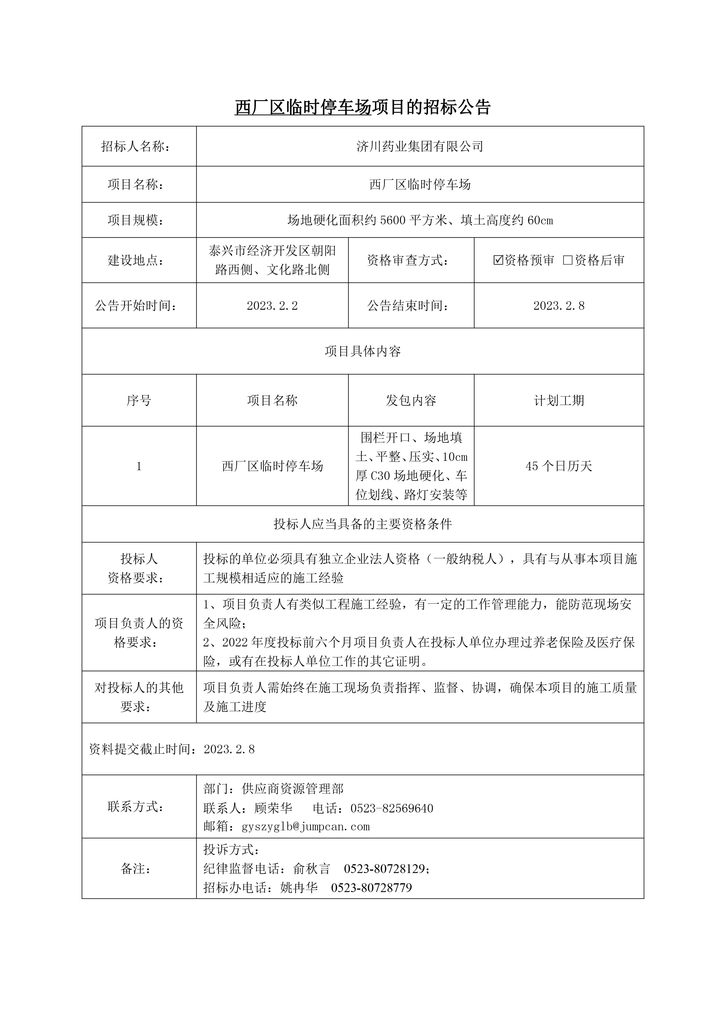 西厂区临时停车场项目招标公告