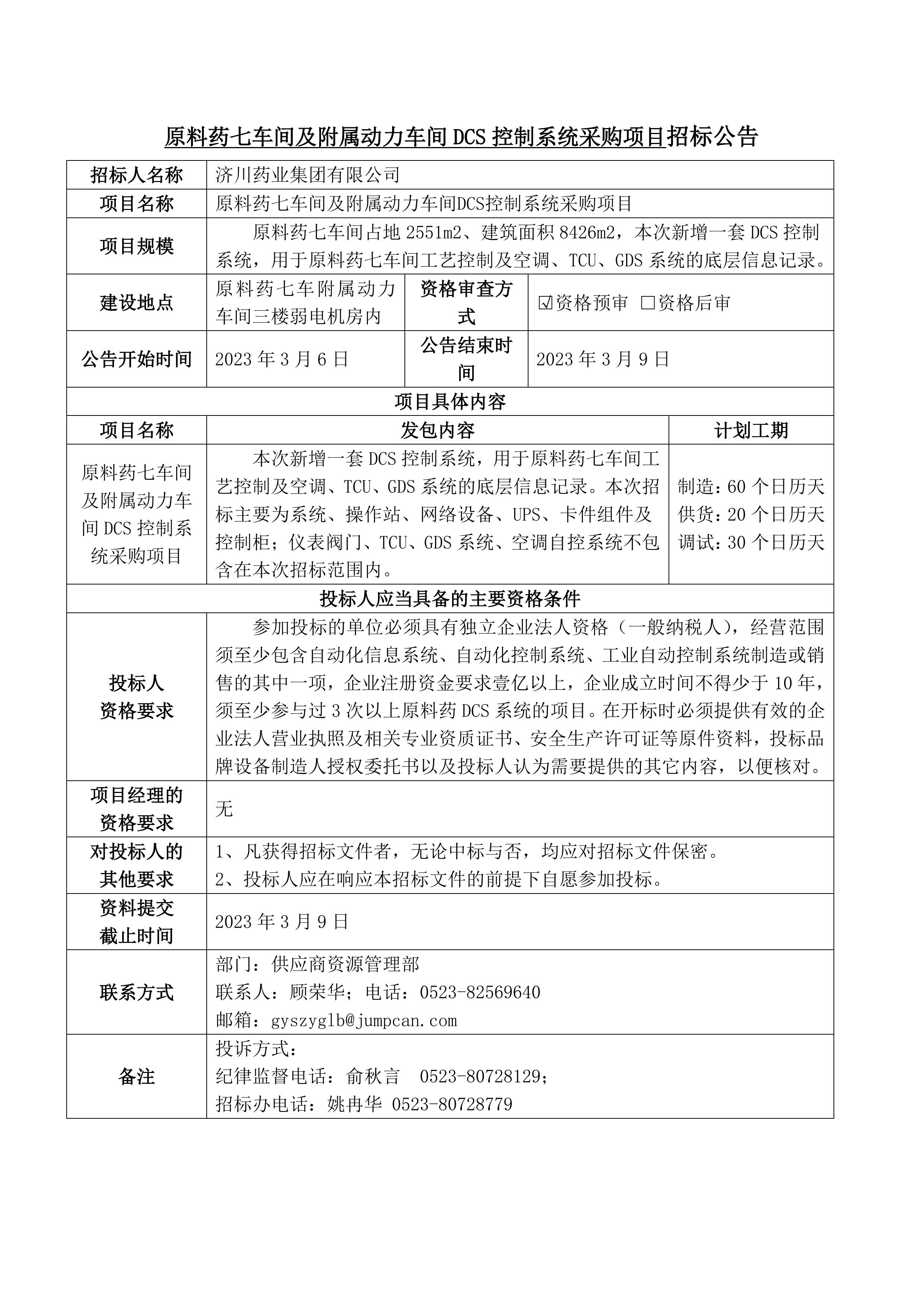 原料药七车间及附属动力车间DCS控制系统采购项目