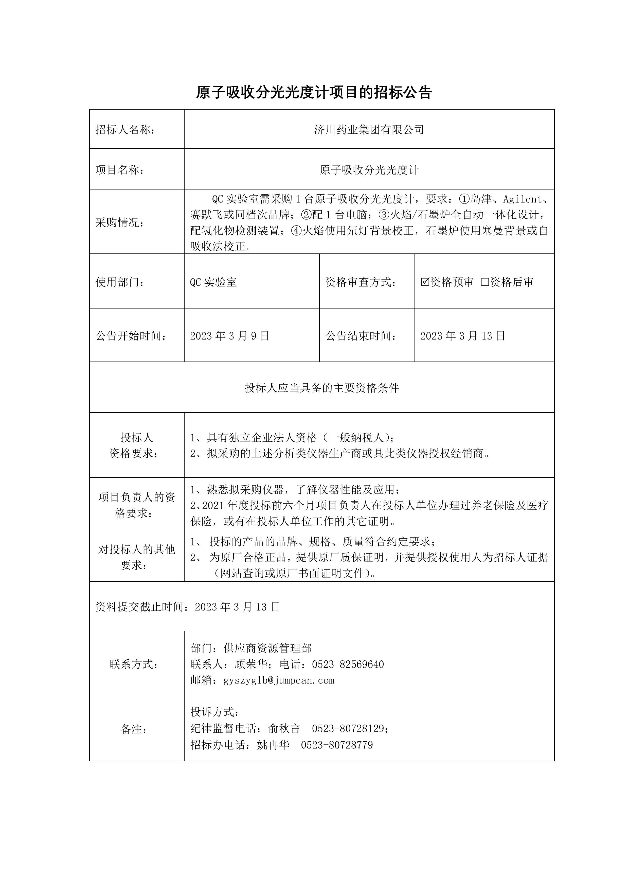 原子吸收分光光度计招标采购公示说明