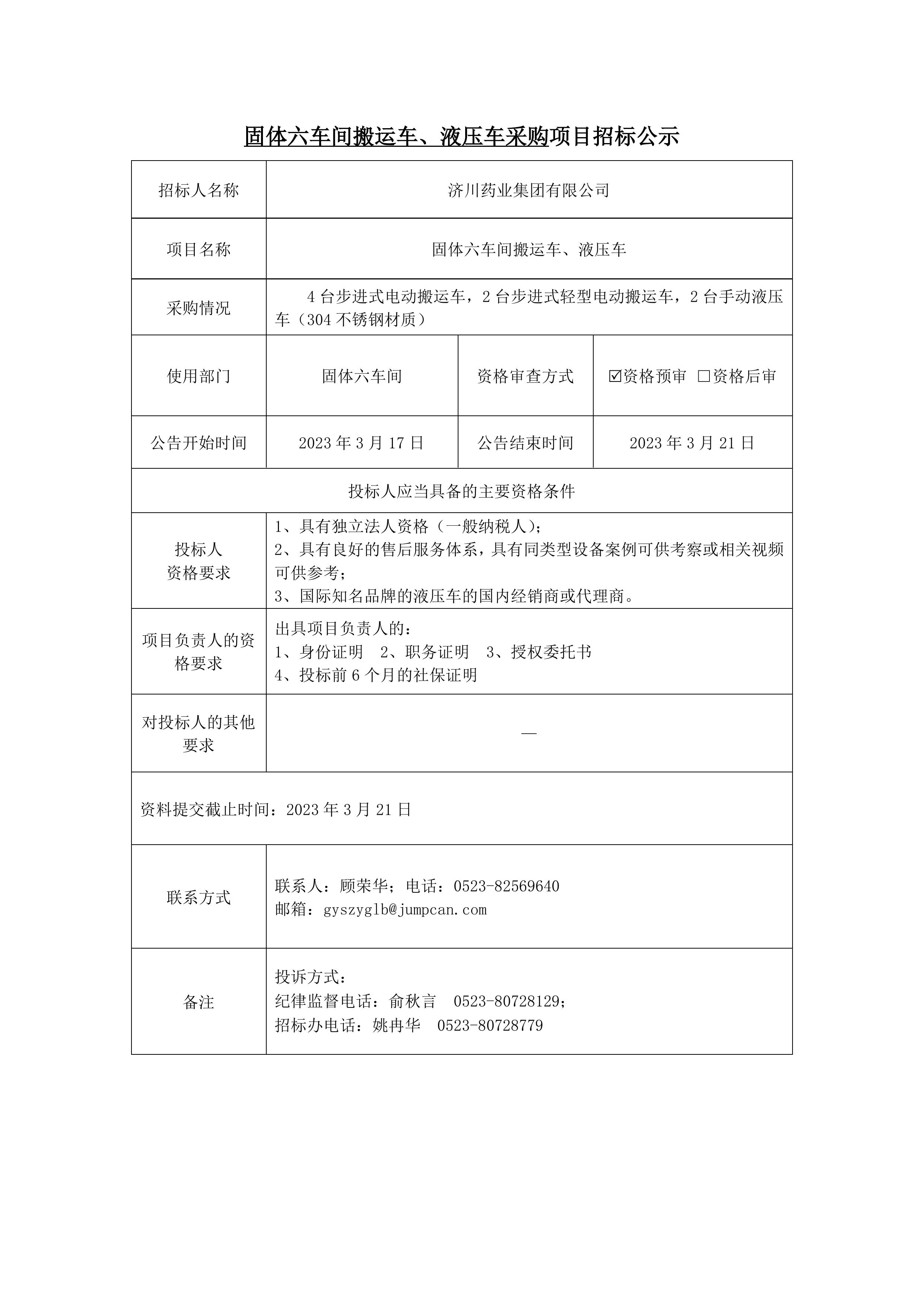 固体六车间液压车采购项目招标公示