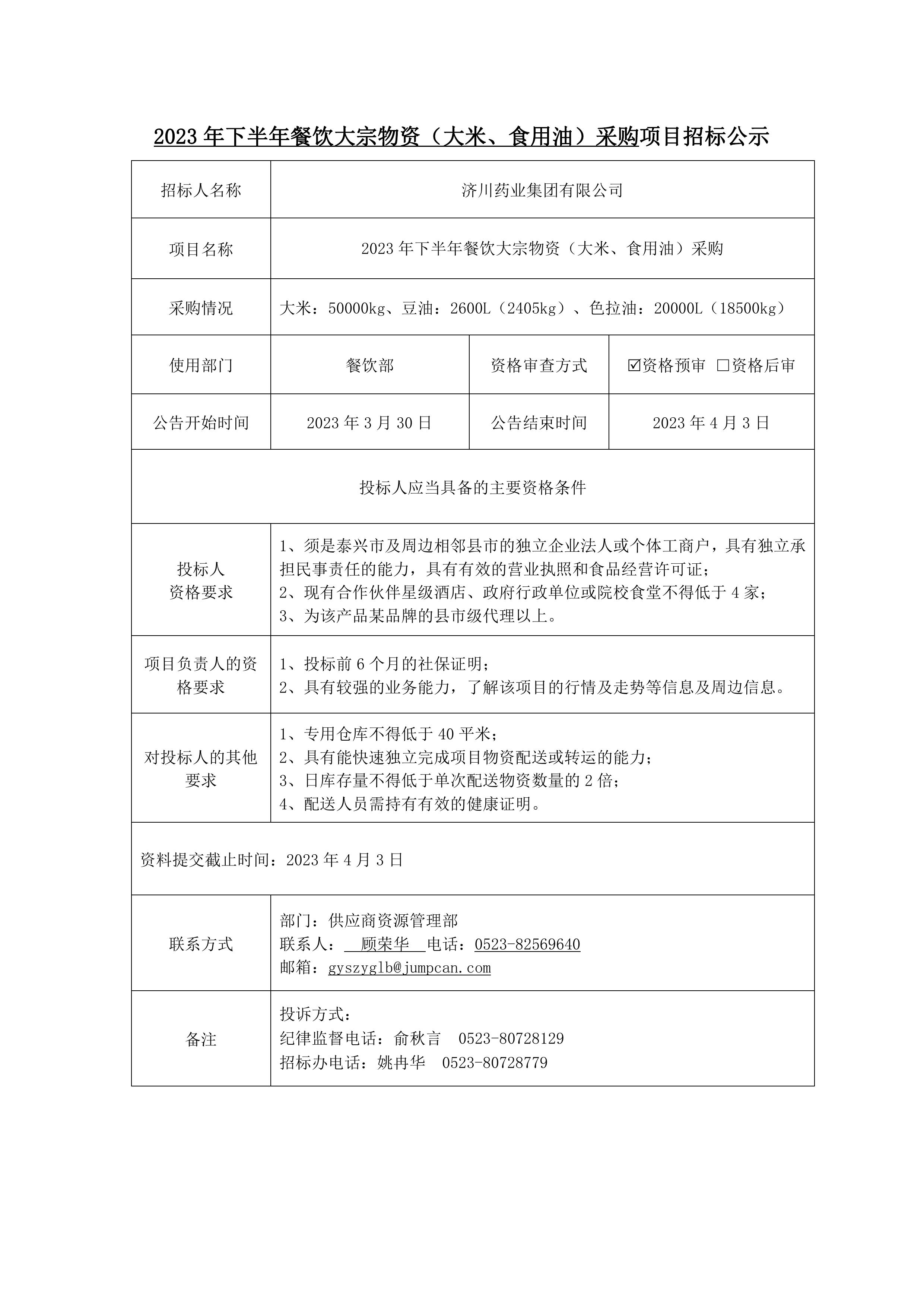 2023年下半年餐饮大宗物资(大米、食用油)采购项目招标公示