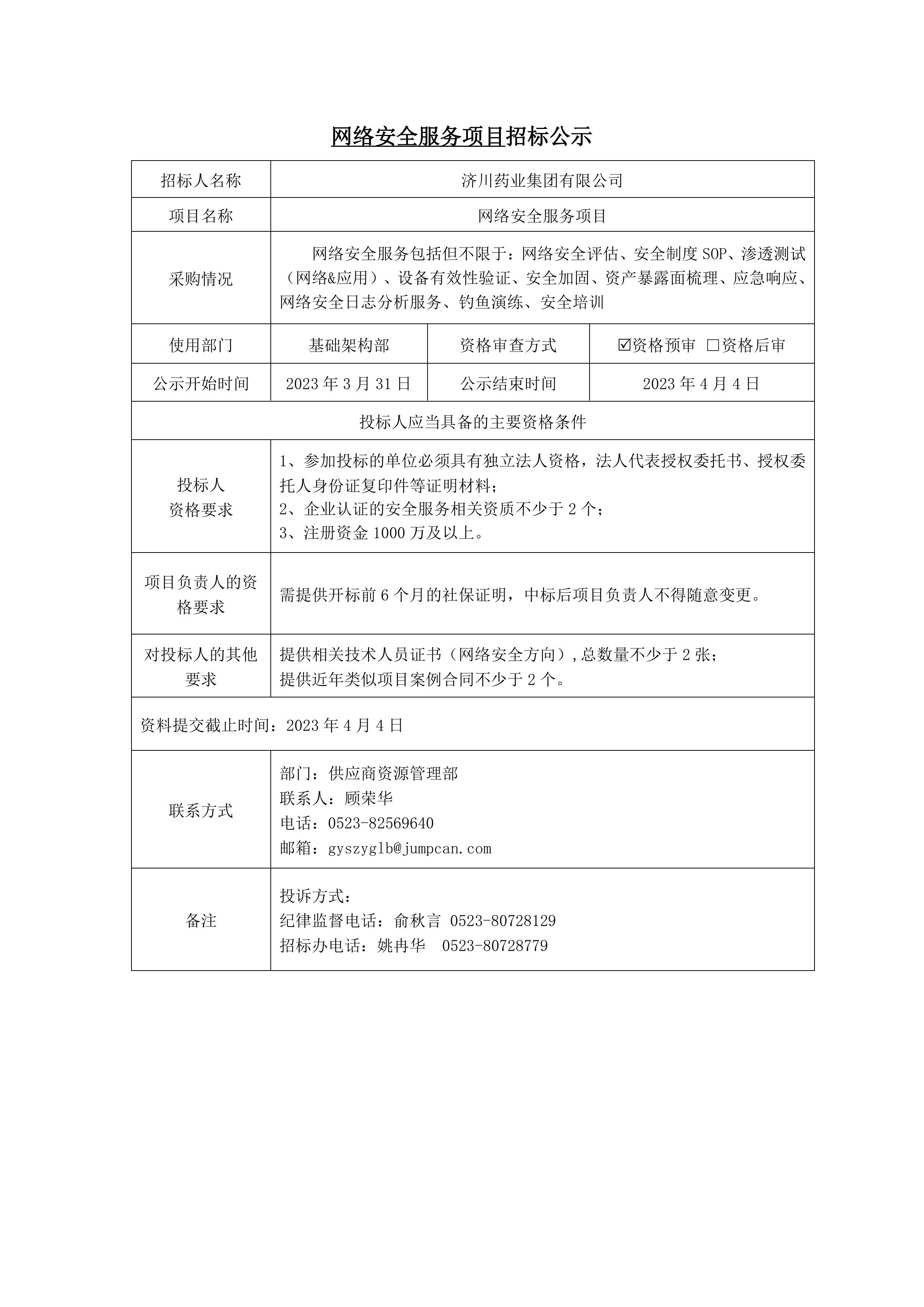 网络安全服务项目招标公示