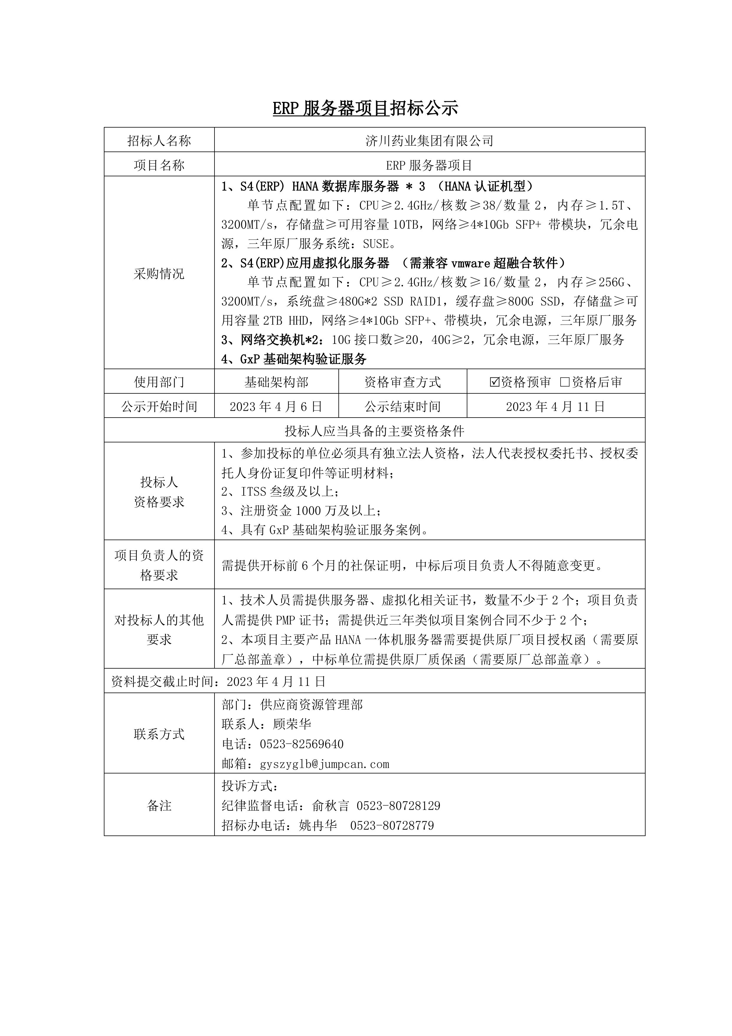 ERP服务器项目招标公示