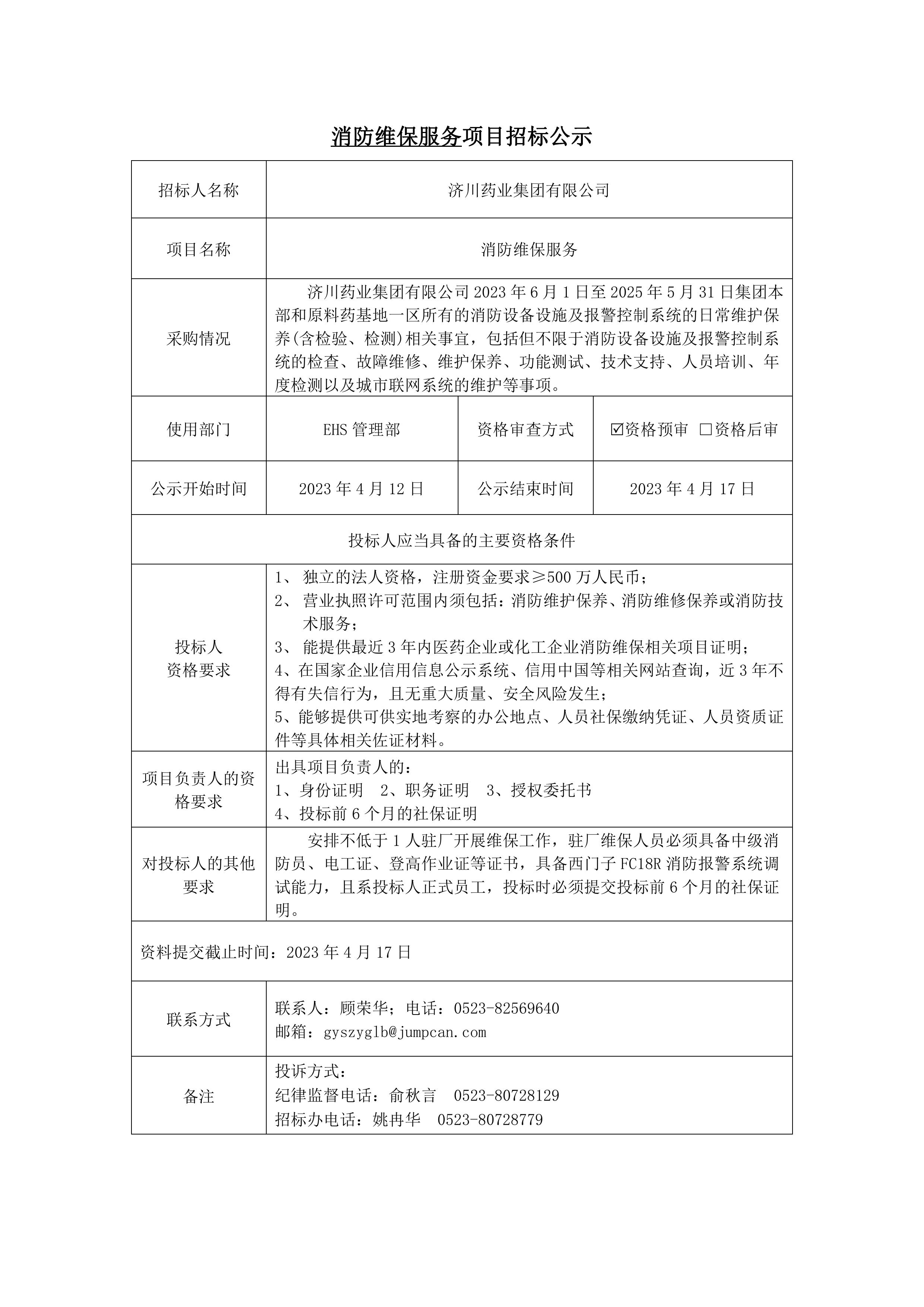 消防维保服务项目招标公示