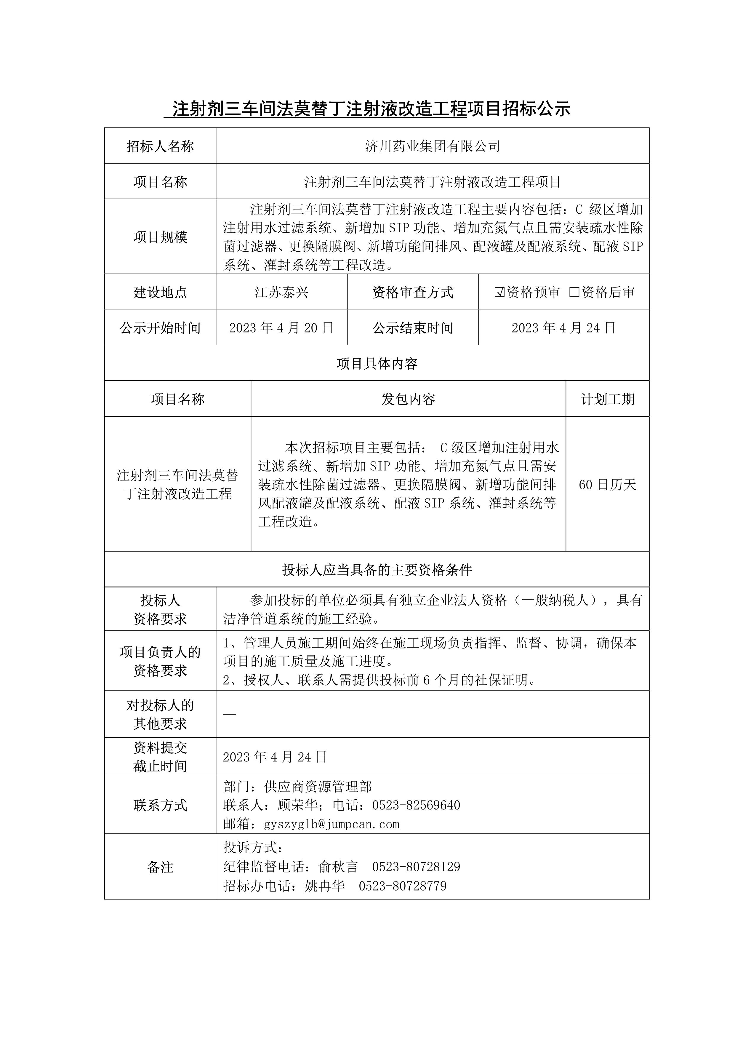 注射剂三车间法莫替丁注射液改造工程招标公示