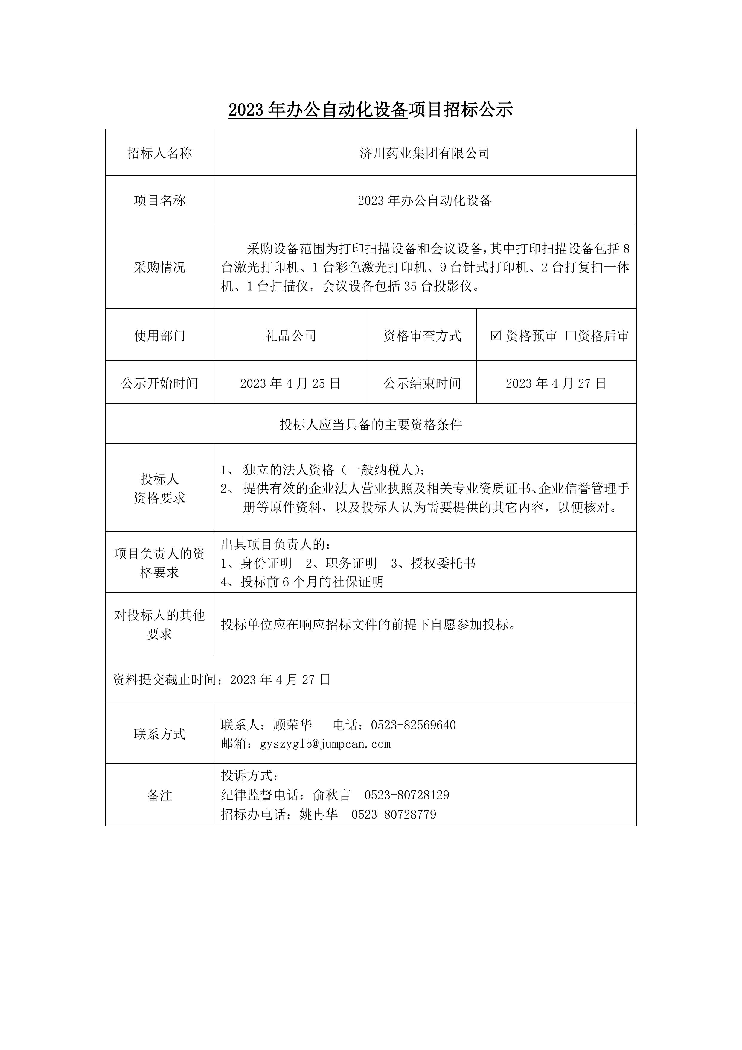 2023年办公自动化设备招标项目招标公示