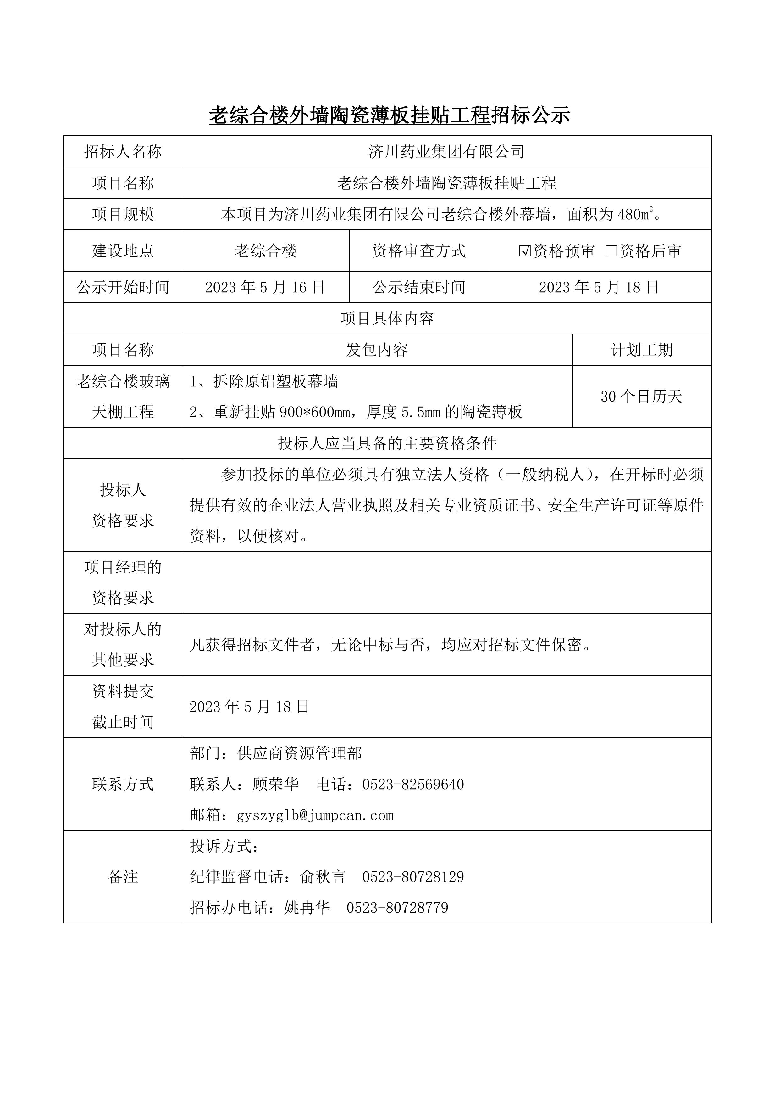 综合楼外墙陶瓷薄板挂贴工程招标公示