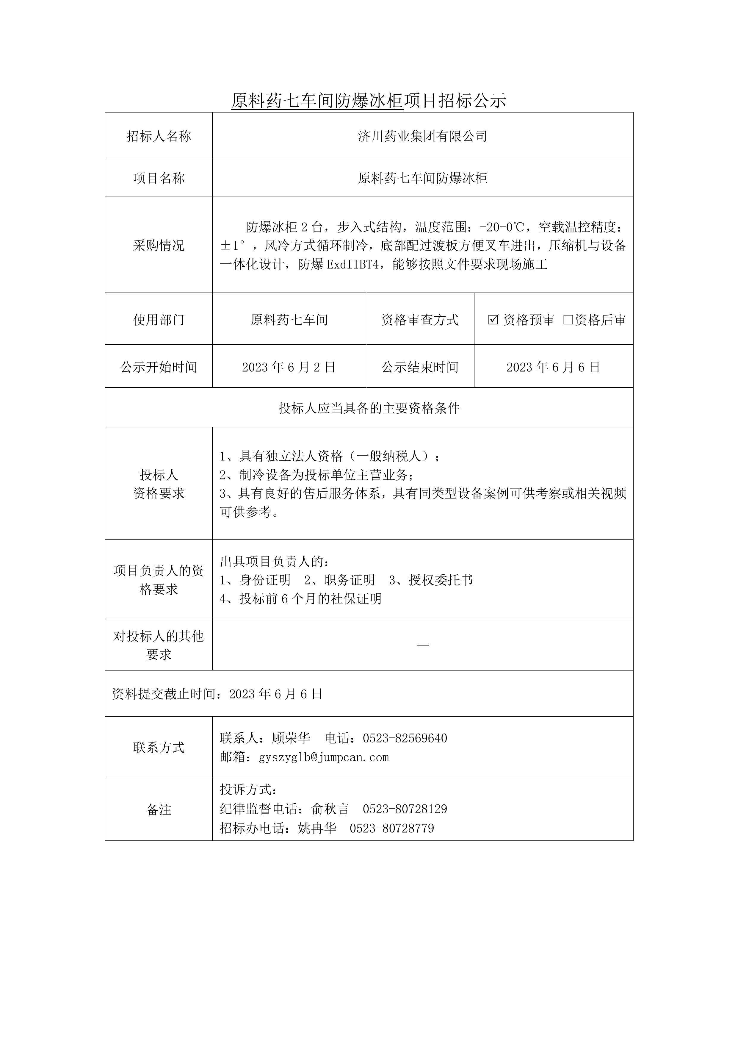原料药七车间防爆冰柜招标公示