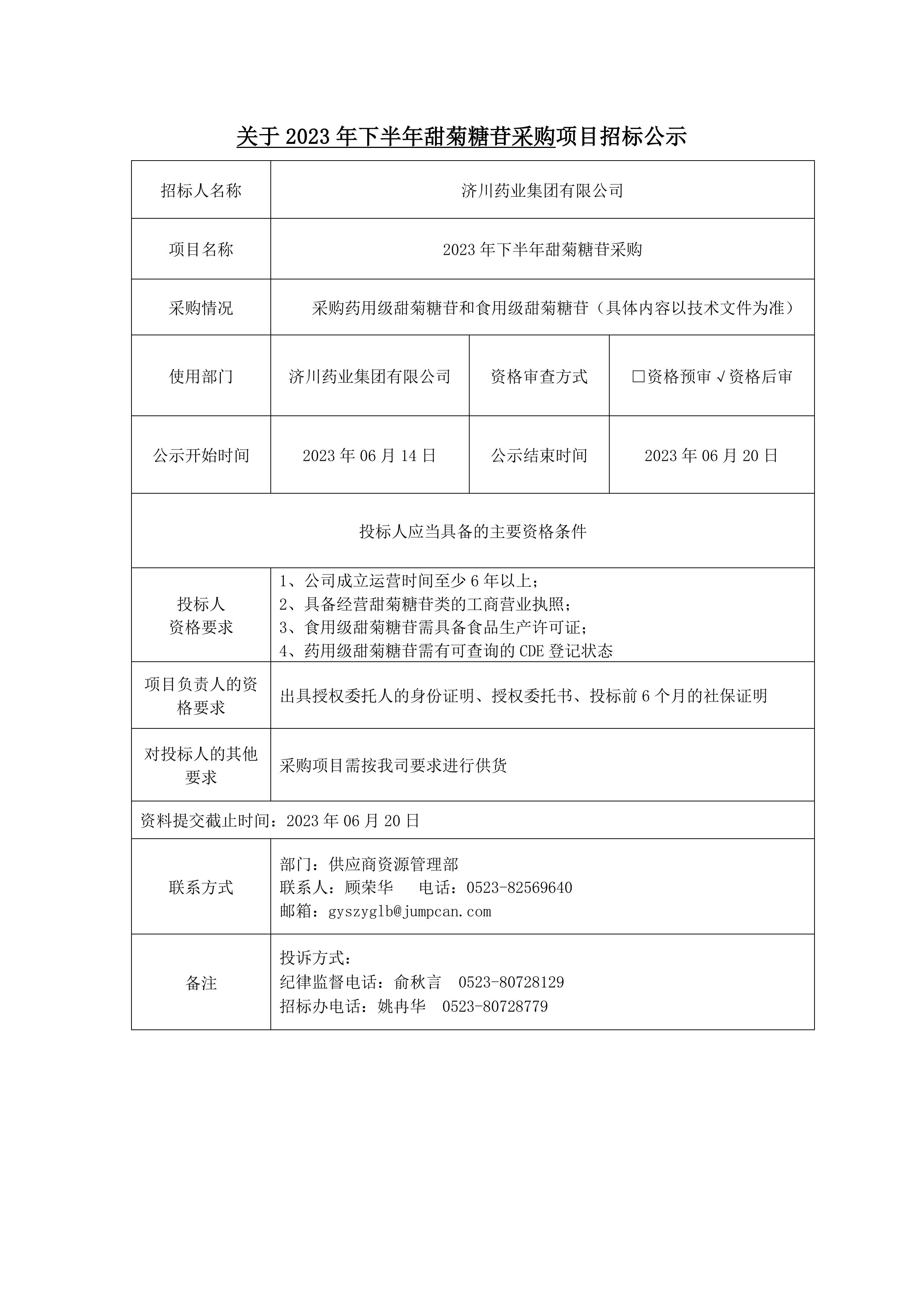 关于2023年下半年甜菊糖苷采购项目招标公示