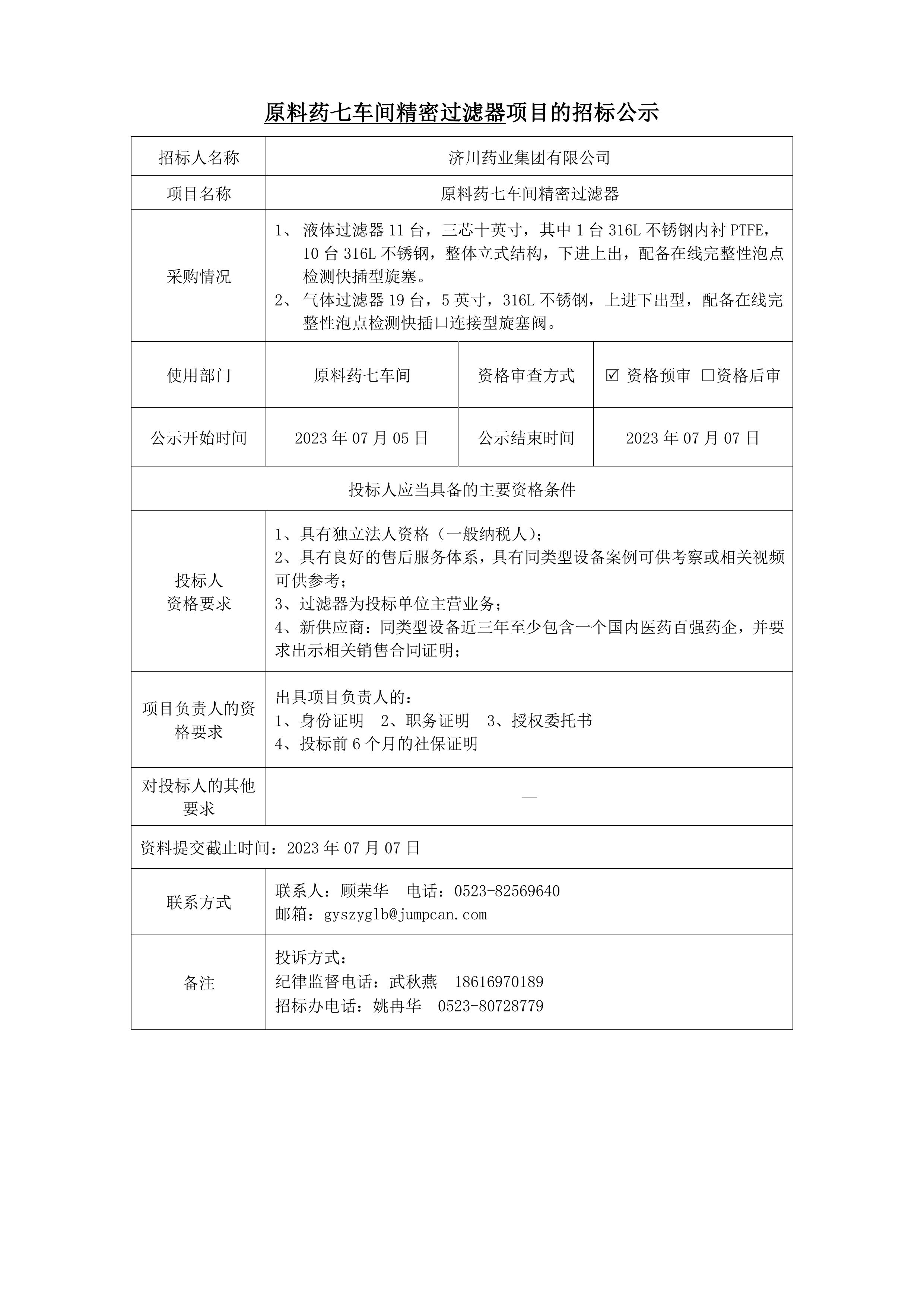 原料药七车间精密过滤器招标公示