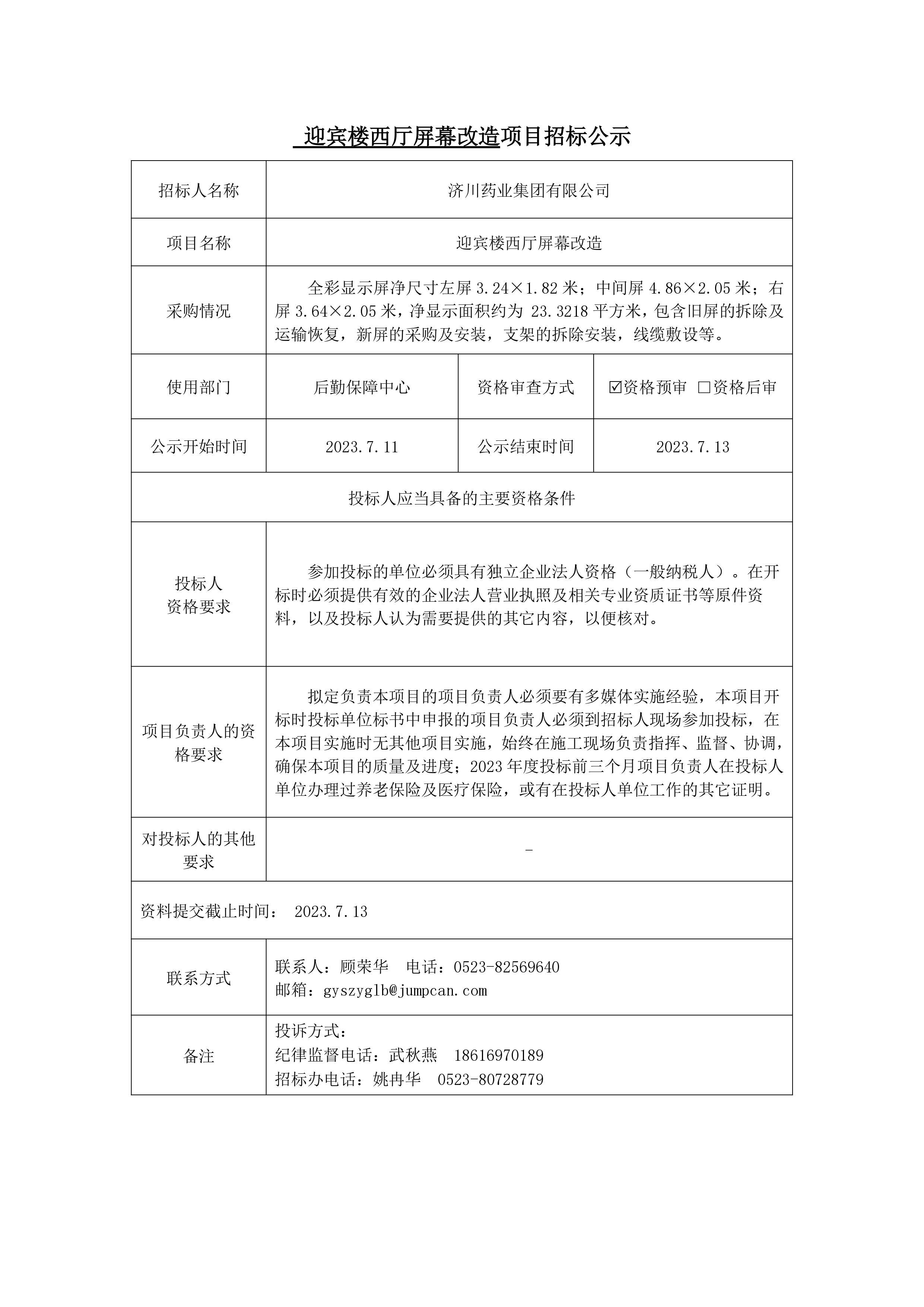 迎宾楼西厅屏幕改造项目招标公示