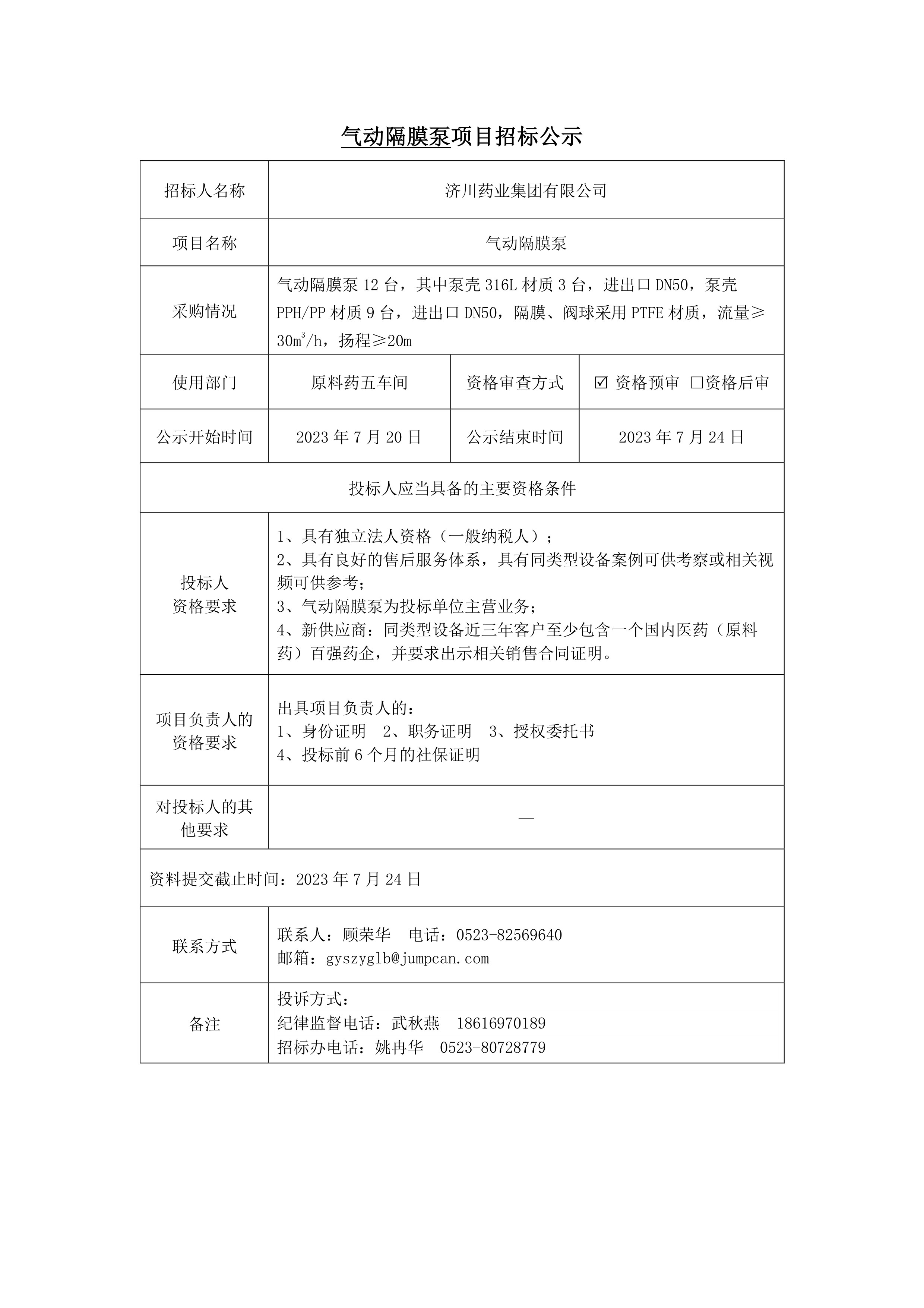气动隔膜泵项目招标公示