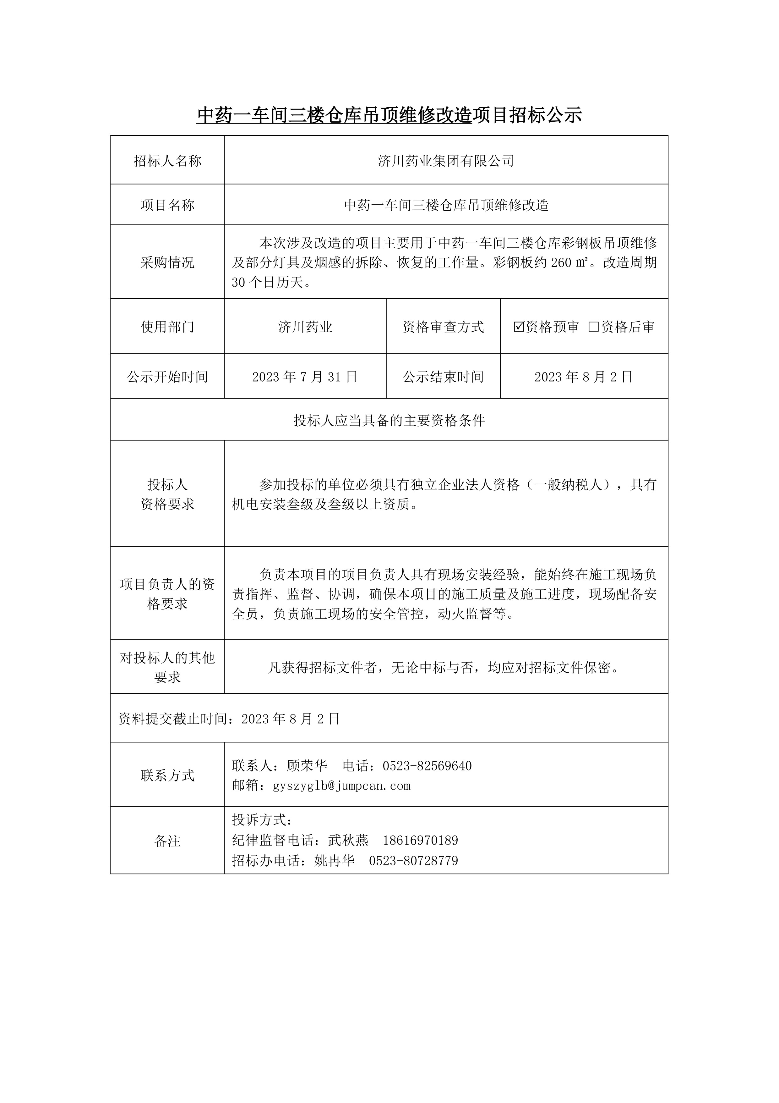中药一车间三楼仓库吊顶维修改造项目招标公示