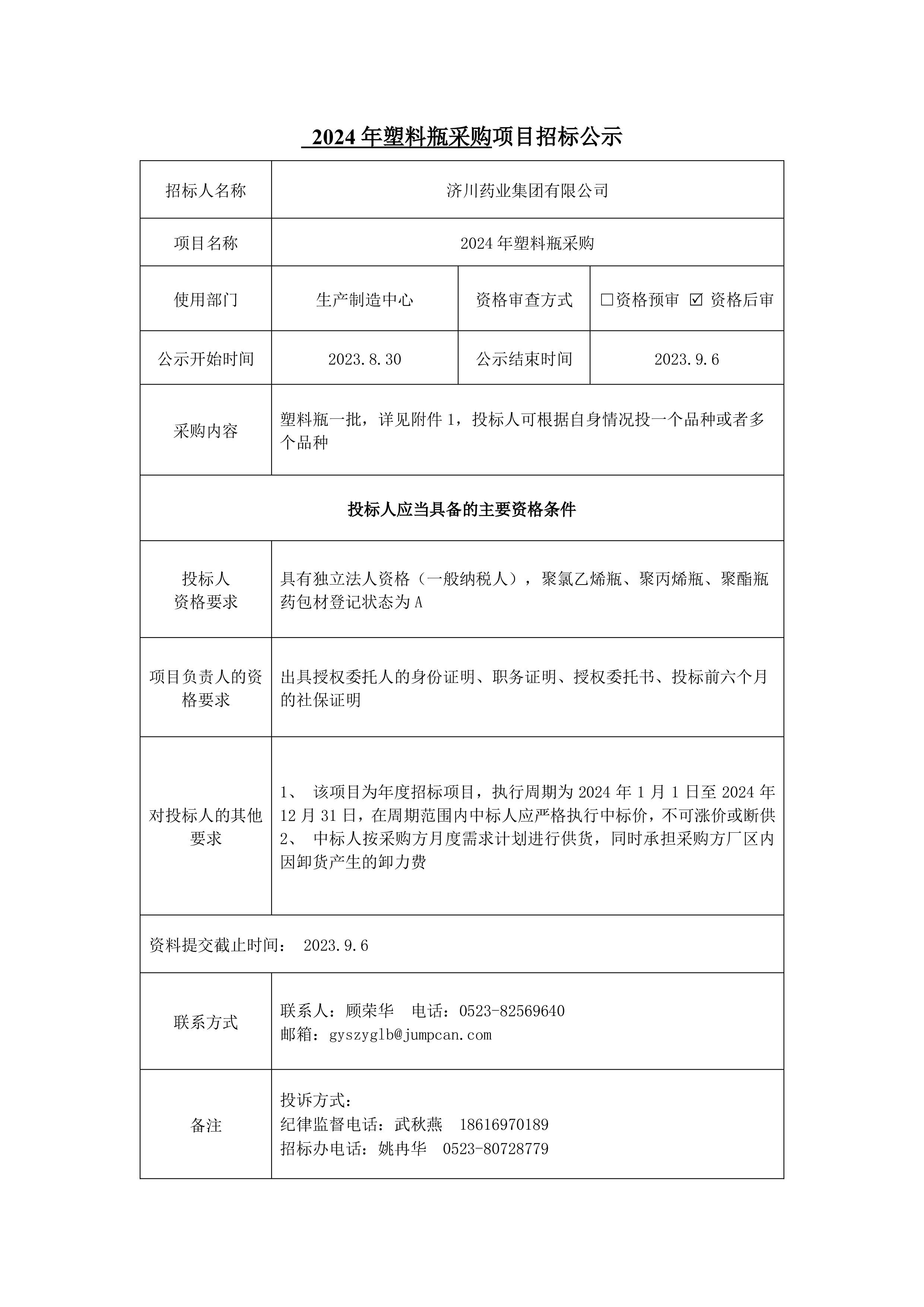 2024年塑料瓶采购项目招标公示