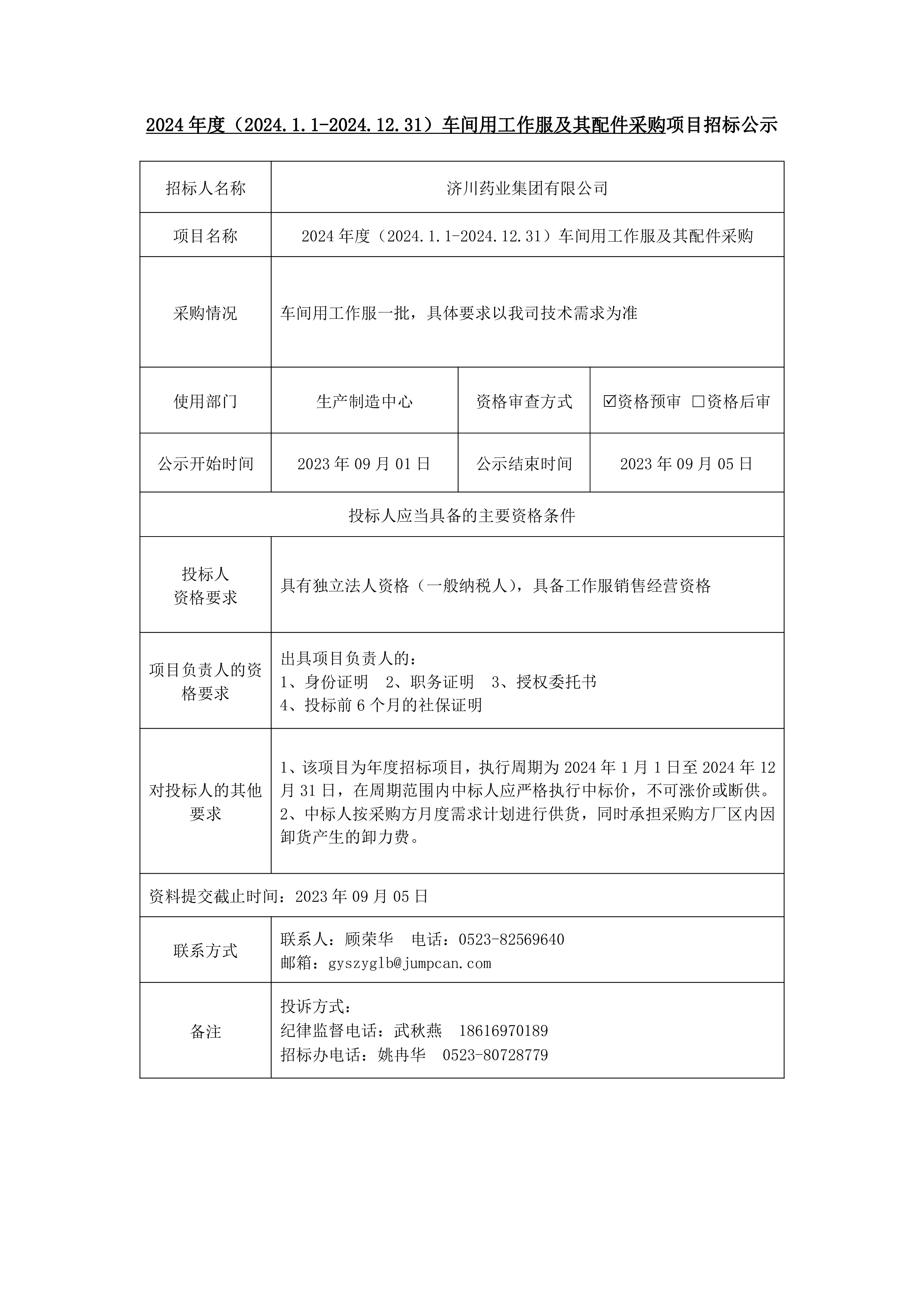 2024年度(2024.1.1-2024.12.31)车间用工作服及其配件采购项目招标公示