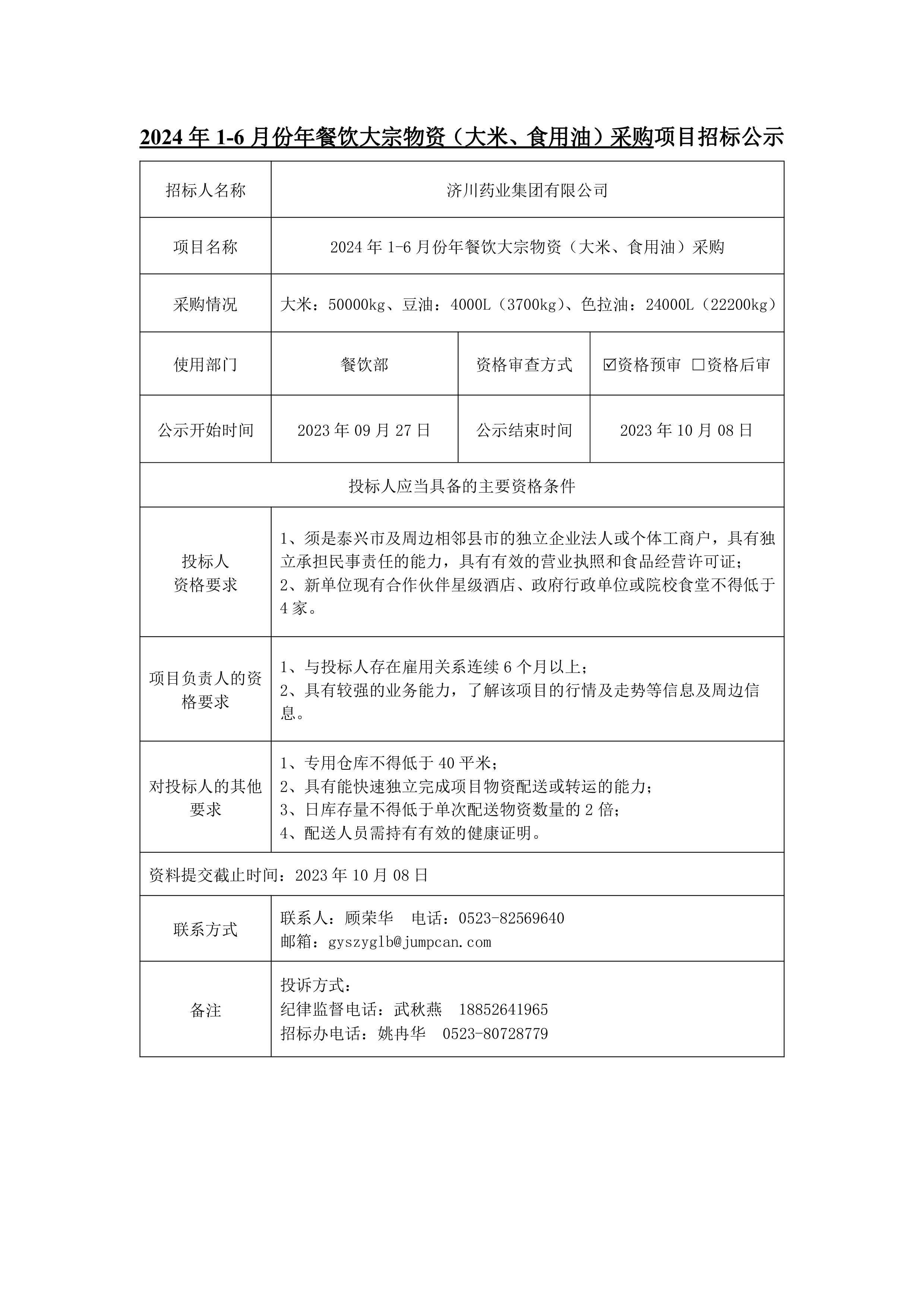 2024年1-6月份年餐饮大宗物资(大米、食用油)采购项目招标公示