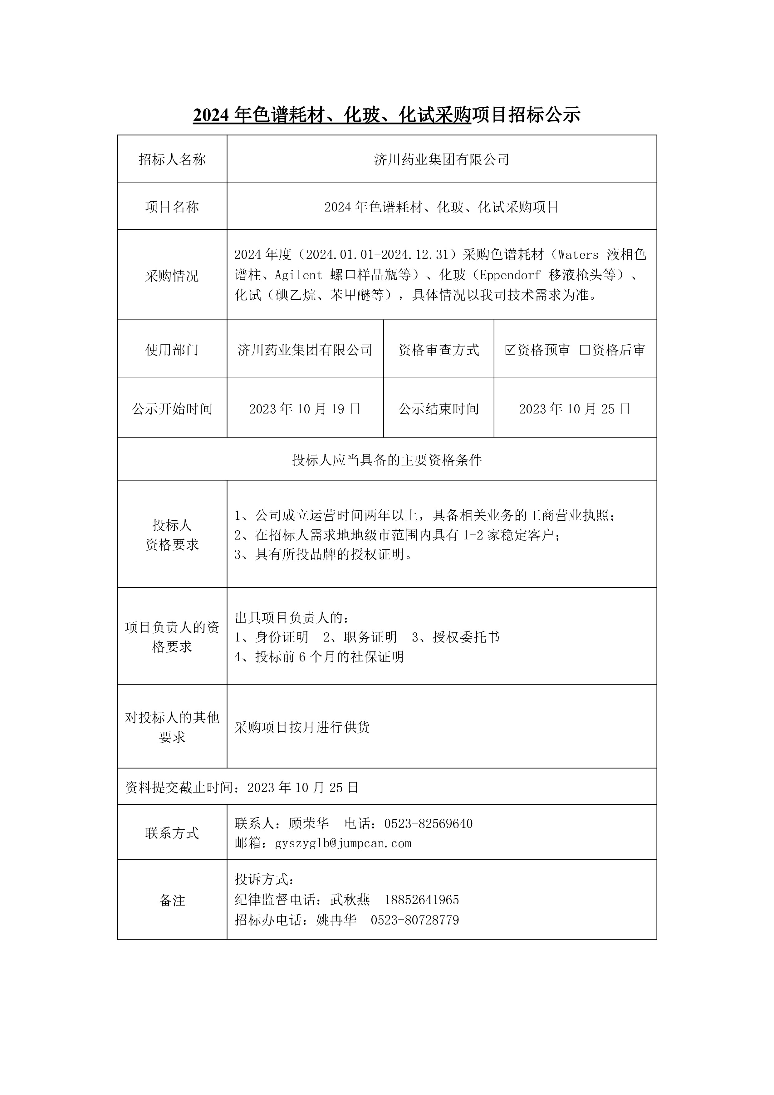 2024年色谱耗材、化玻、化试采购项目招标公示