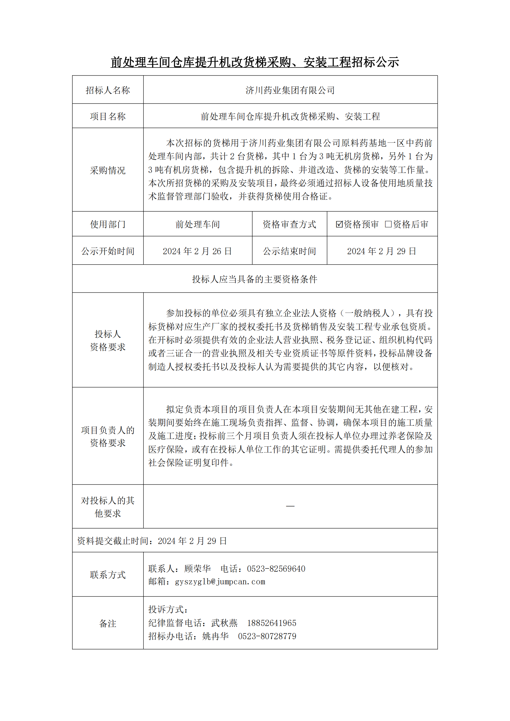 前处理车间仓库提升机改货梯采购、安装工程招标公示