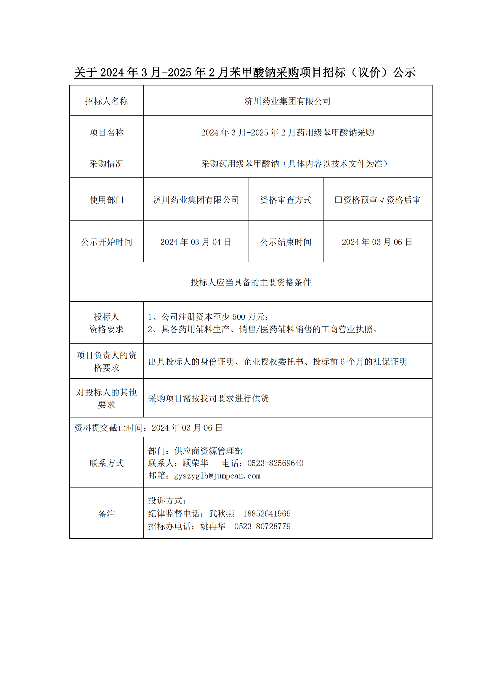2024年3月-2025年2月苯甲酸钠采购项目招标(议价)公示