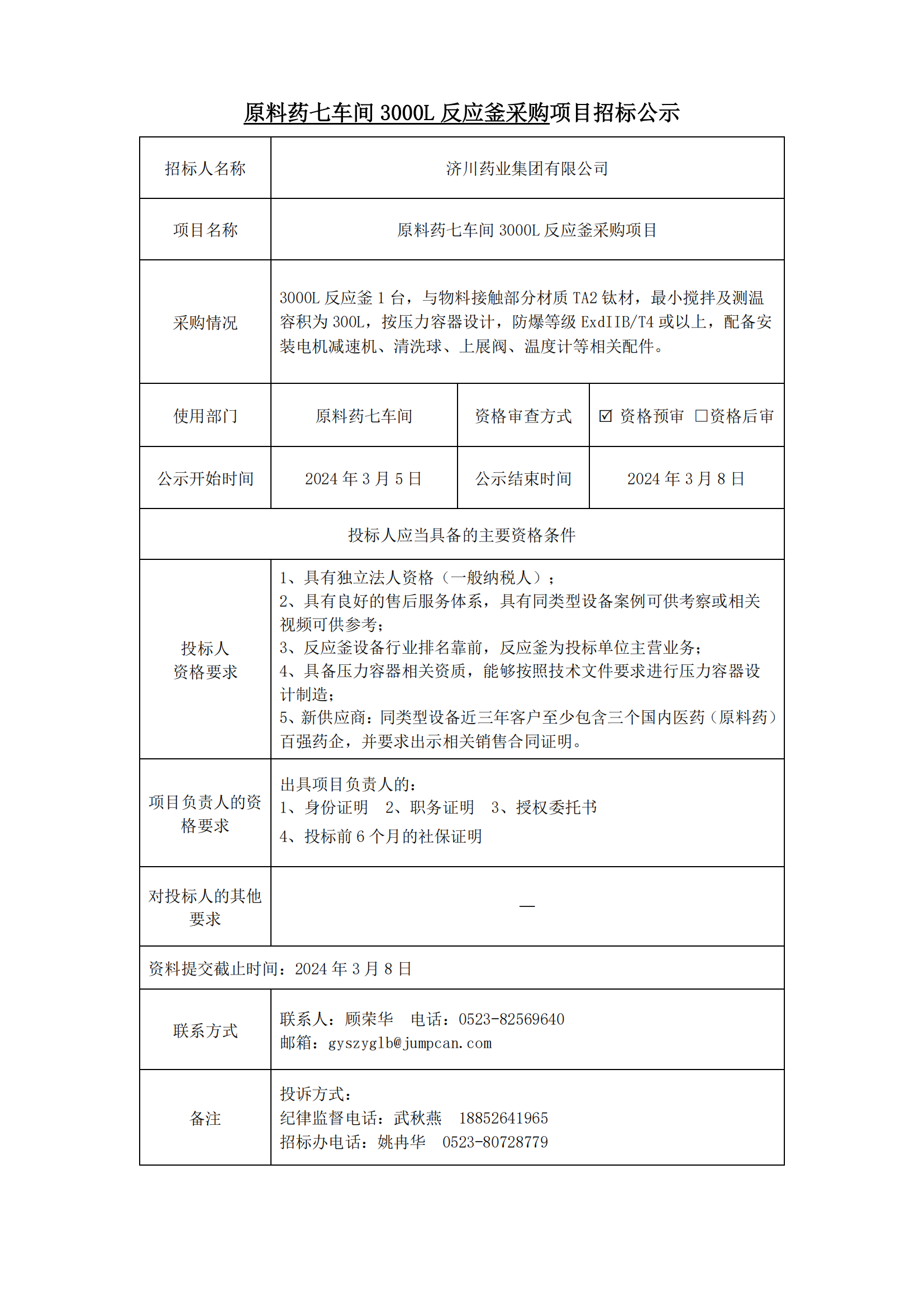 原料药七车间3000L反应釜项目招标公示