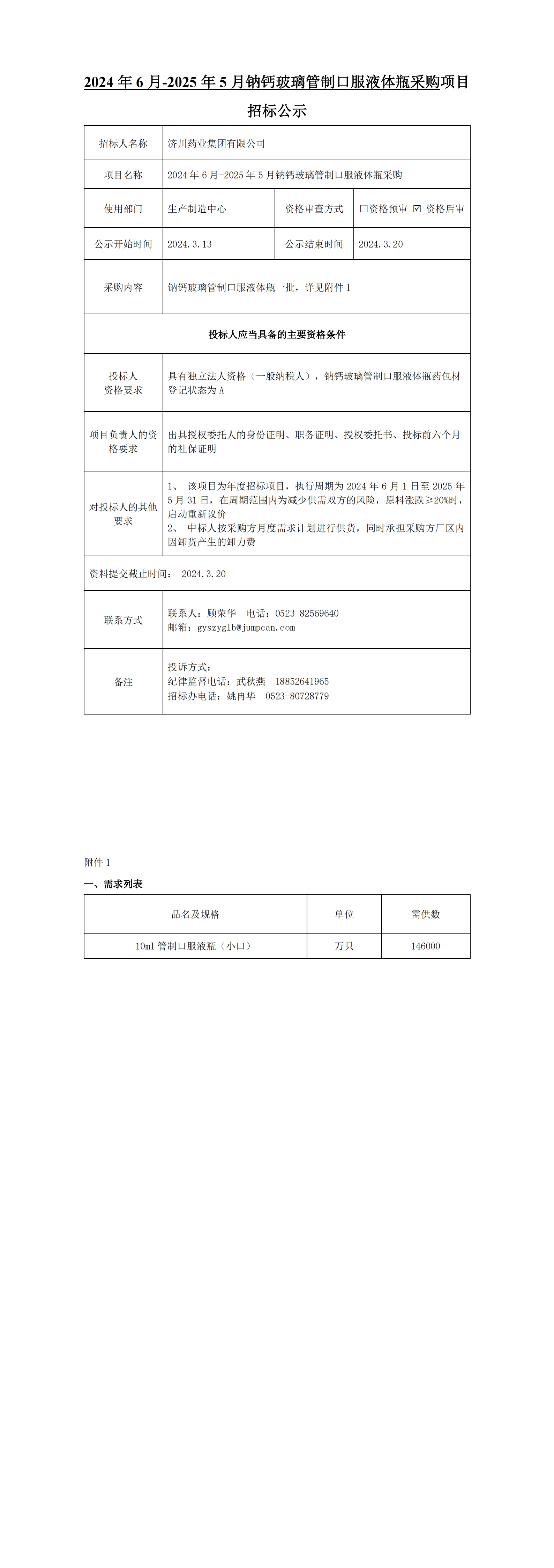 2024年6月-2025年5月钠钙玻璃管制口服液体瓶招标采购项目