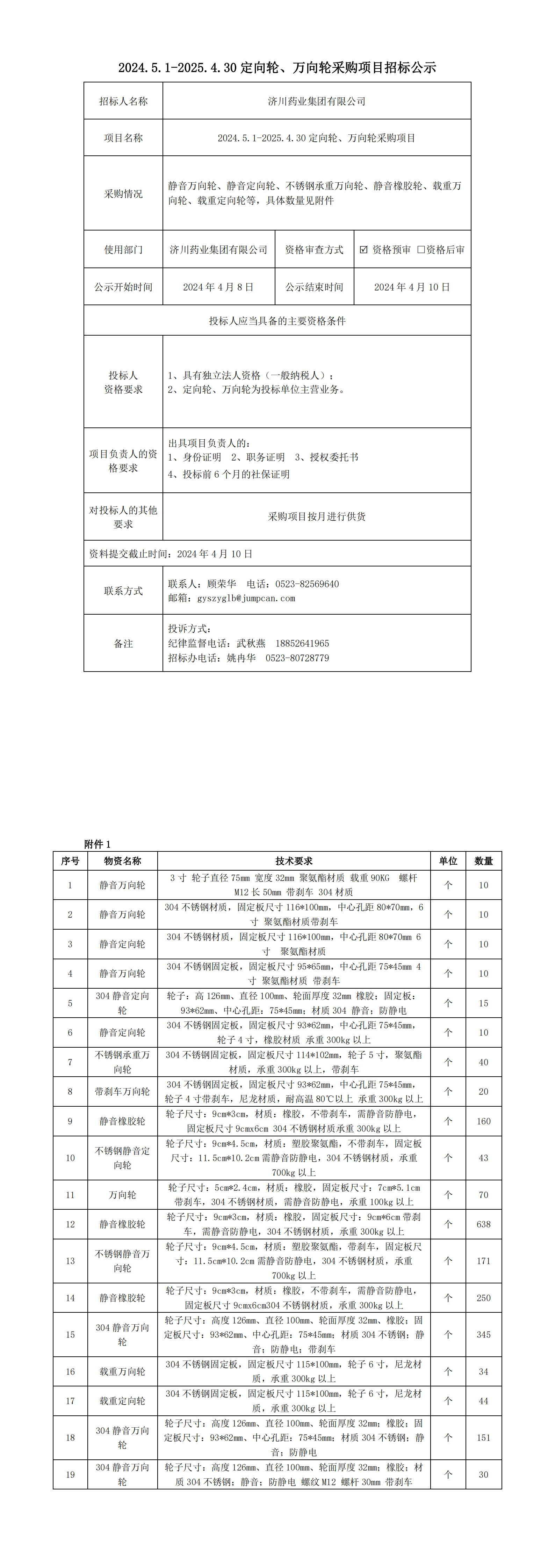 2024.5.1-2025.4.30定向轮、万向轮采购招标