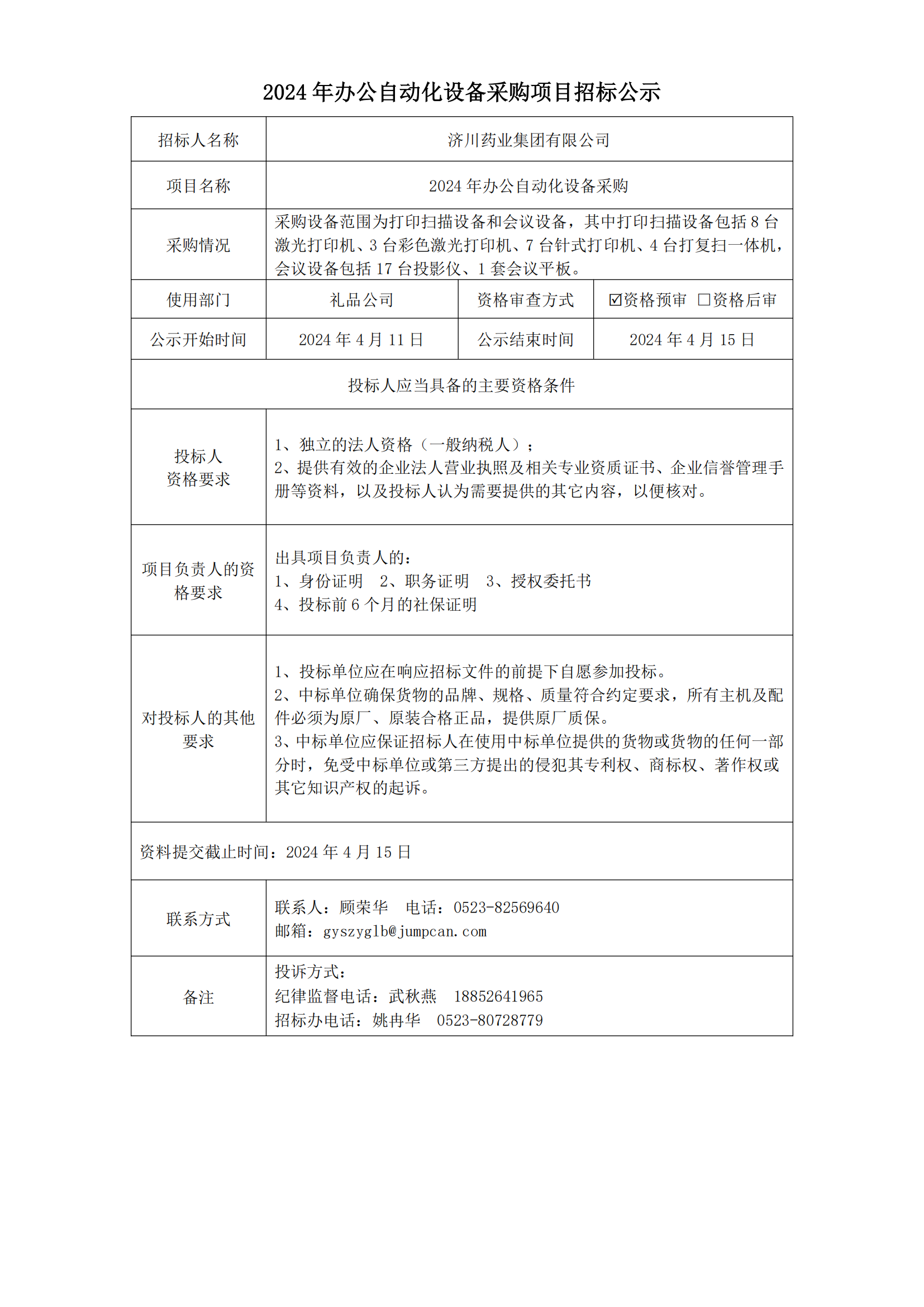2024年办公自动化设备招标公示