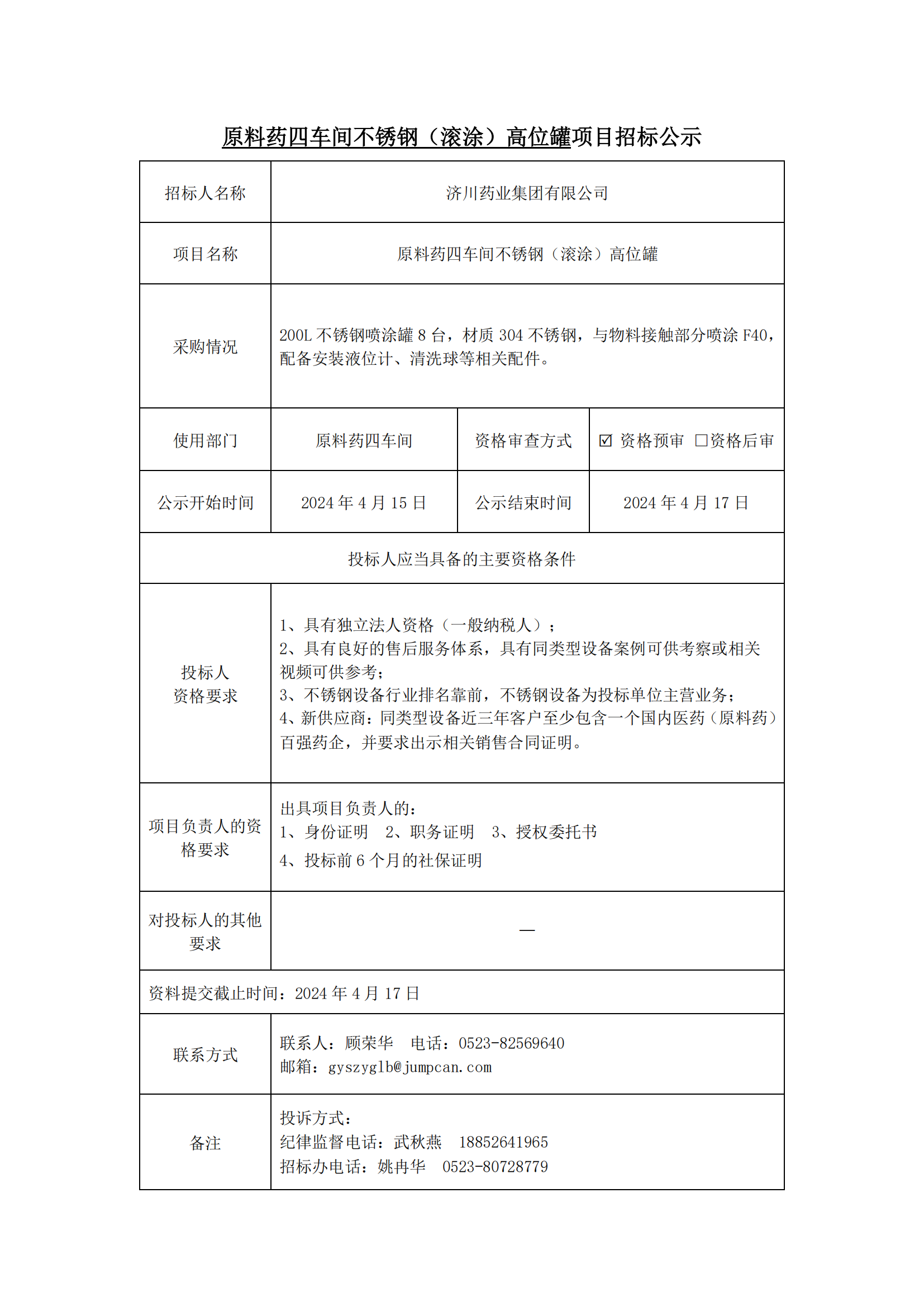 原料药四车间不锈钢(滚涂)高位罐项目招标公示