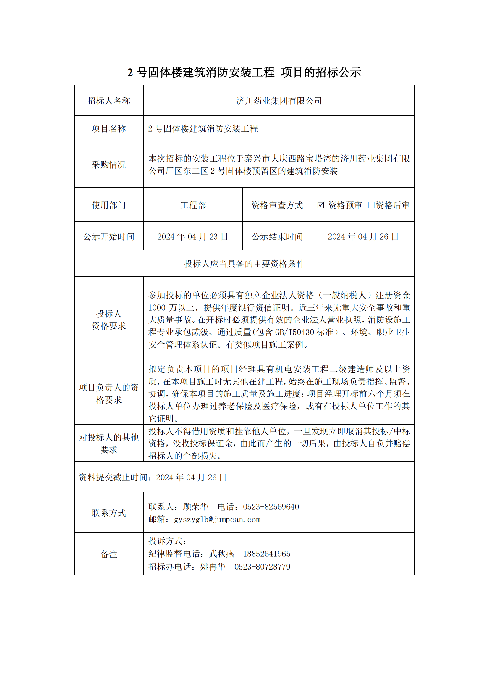 2号固体楼建筑消防安装工程项目招标公示