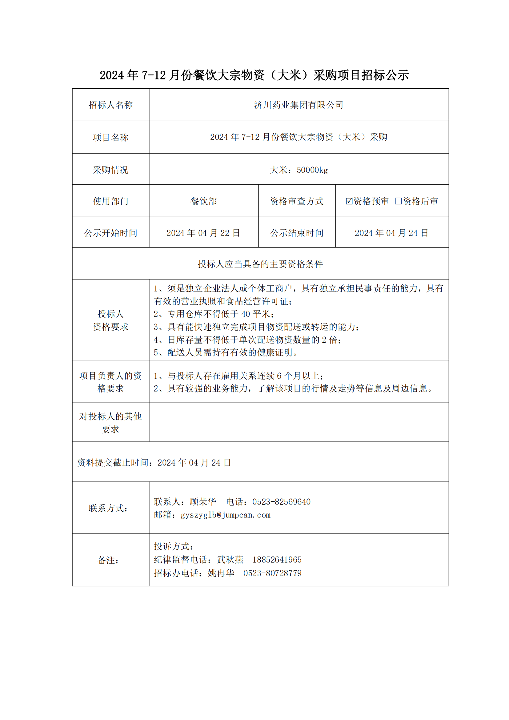 2024年7-12月份餐饮大宗物资(大米)采购项目招标公示