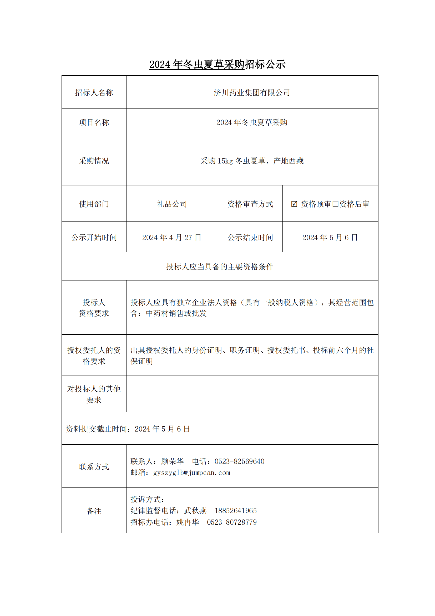 2024年冬虫夏草采购招标公示