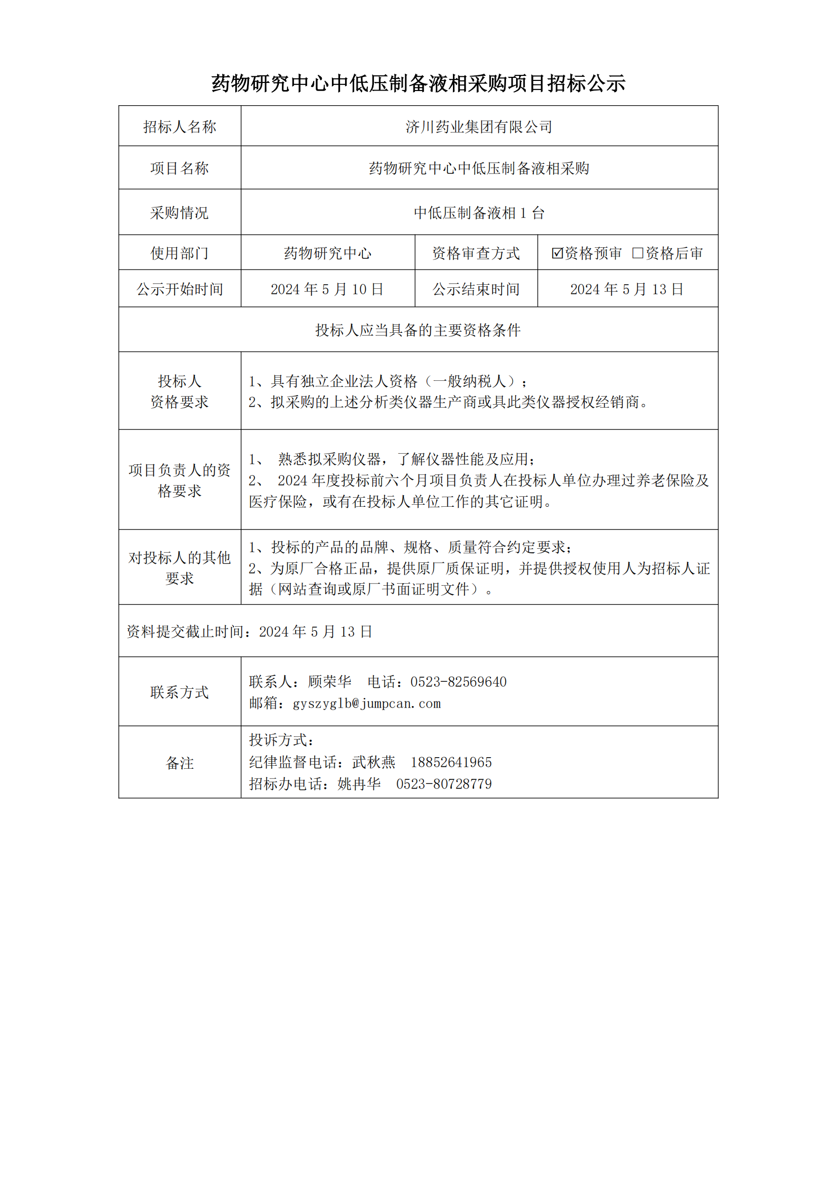 药物研究院中低压制备液相招标公示