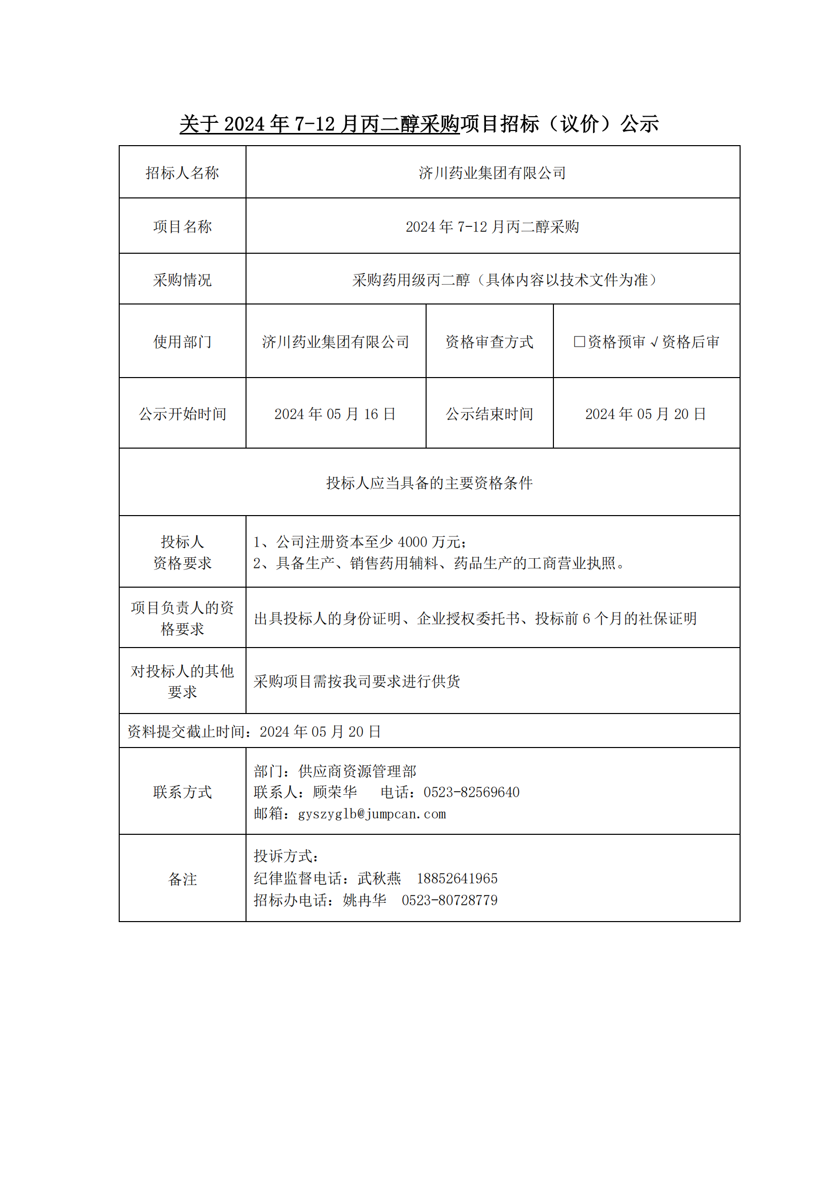 2024年7-12月丙二醇采购项目招标(议价)公示