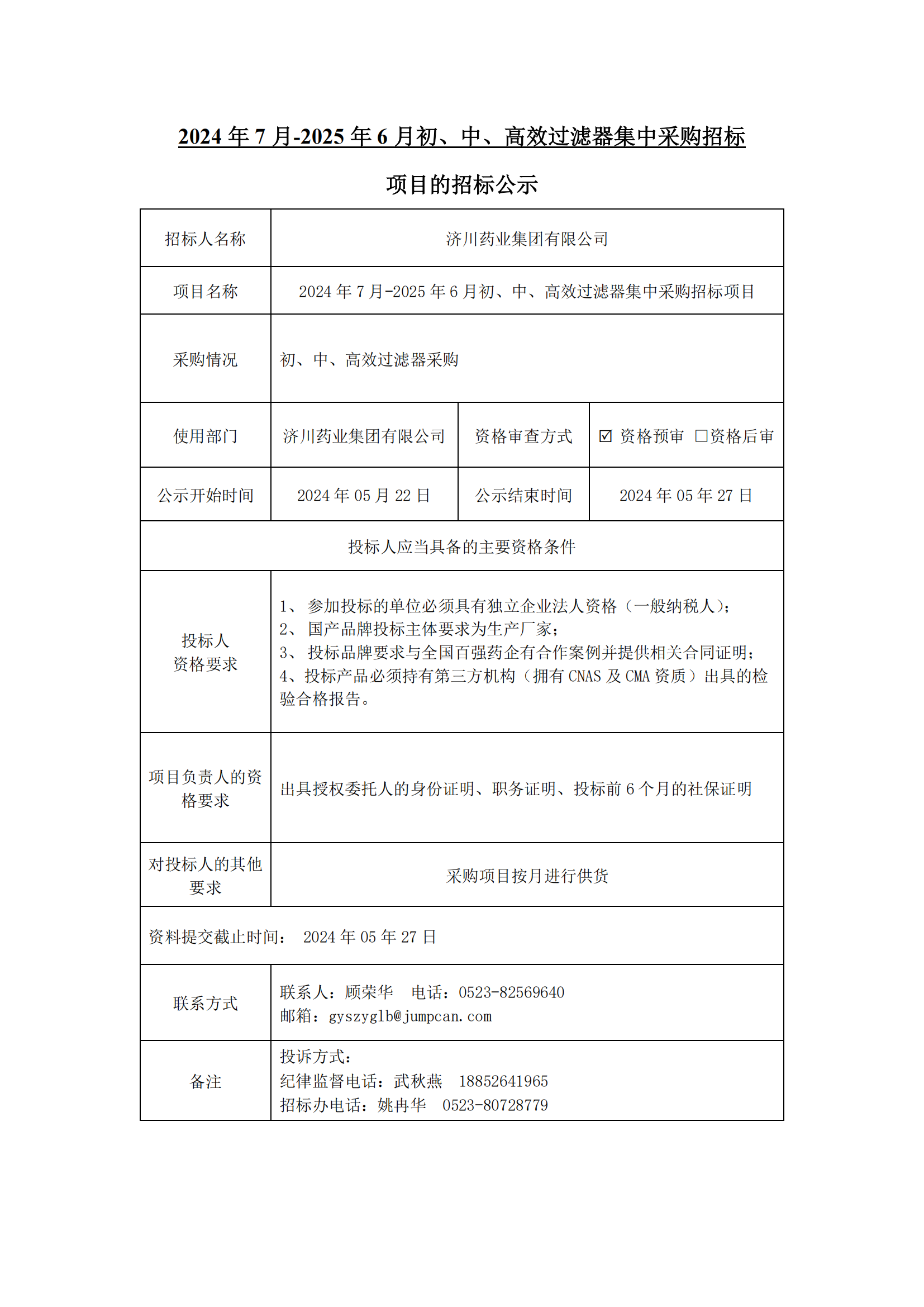 2024年7月-2025年6月初中高效过滤器集中采购招标项目