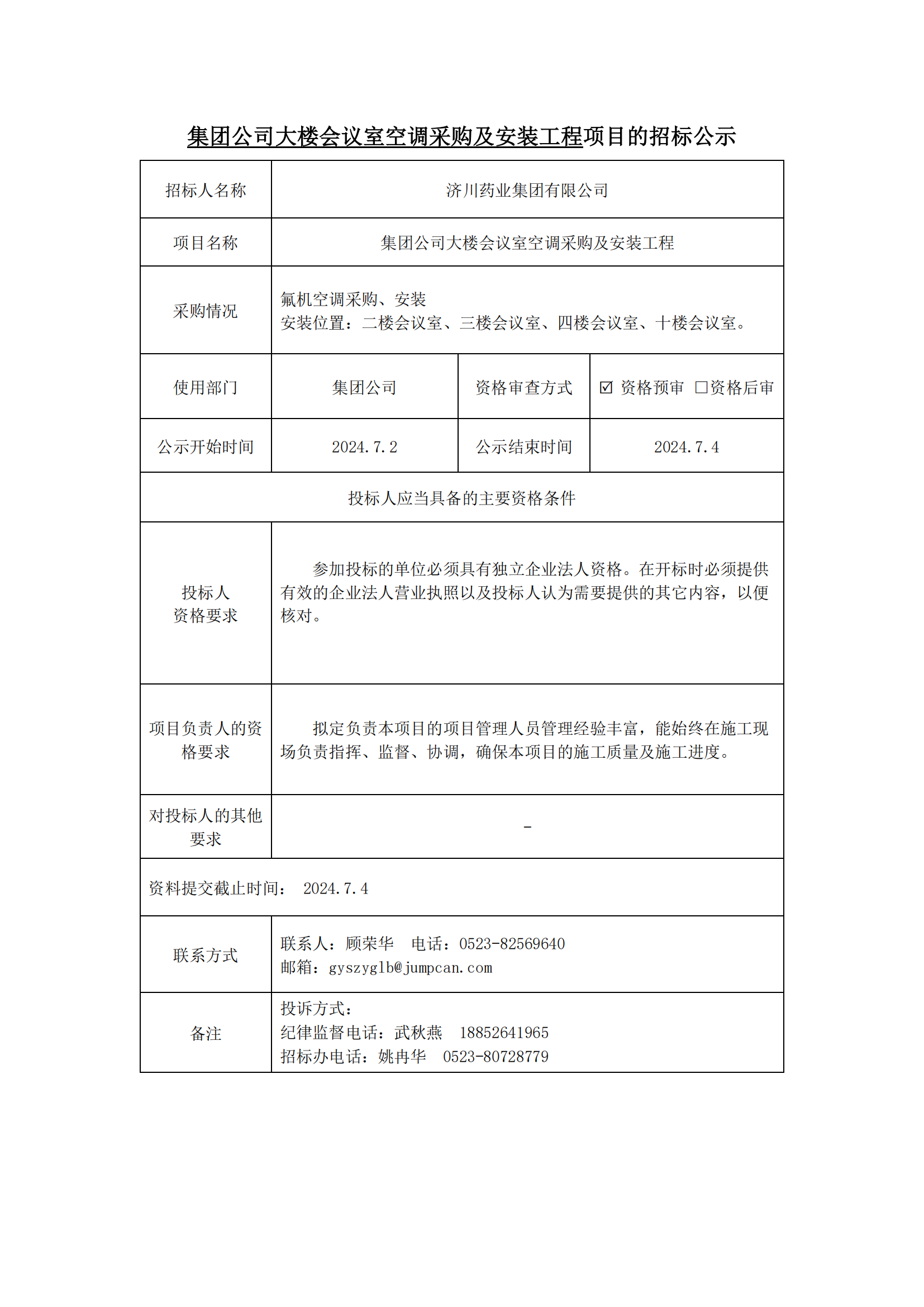 集团公司大楼会议室空调采购及安装工程招标公示