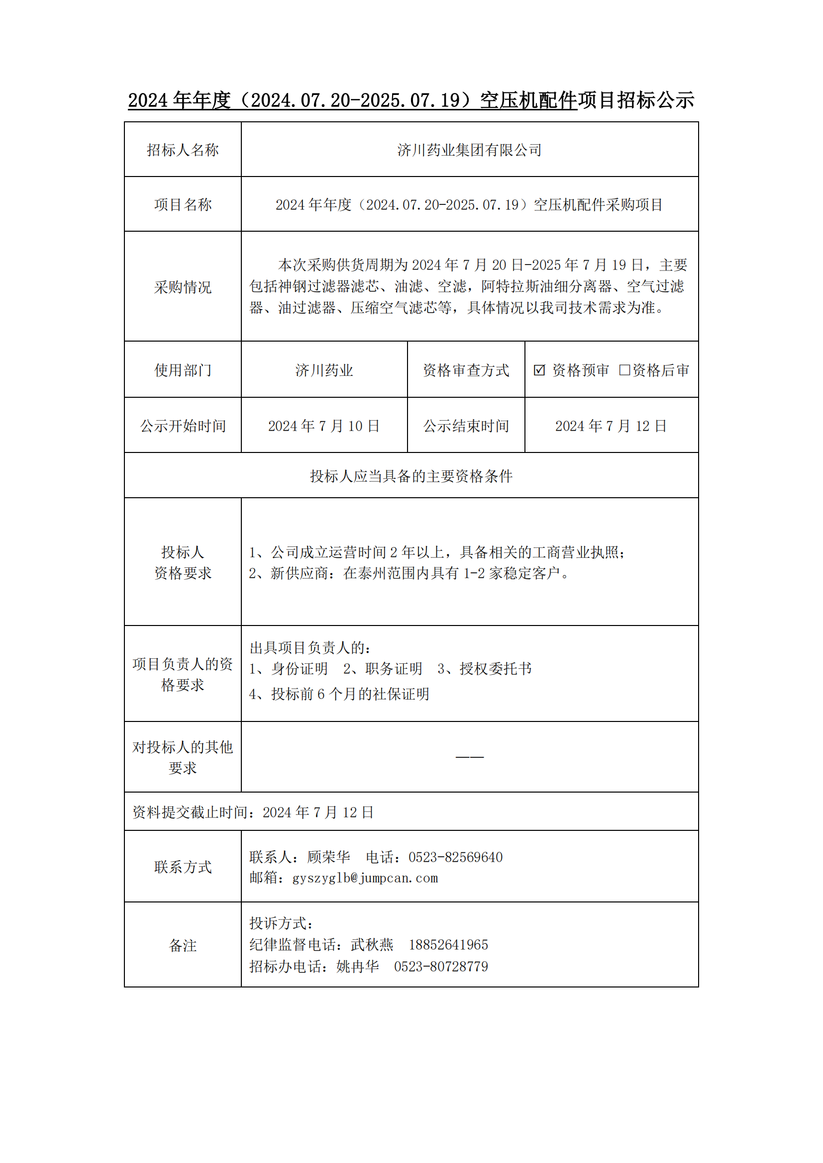 2024年年度(2024.07.20-2025.07.19)空压机配件项目招标公示