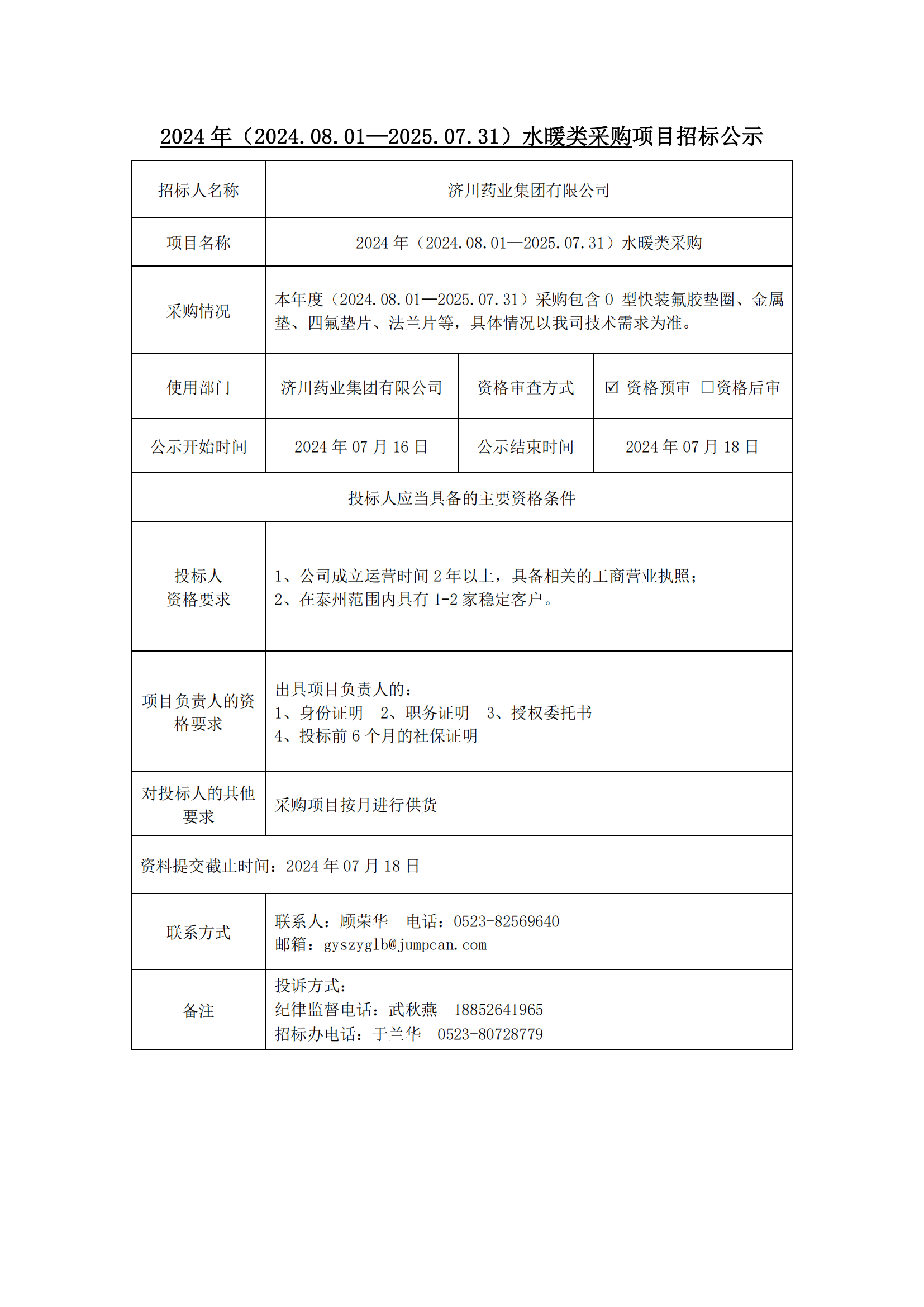 2024 年(2024.08.01—2025.07.31)水暖类项目招标公示