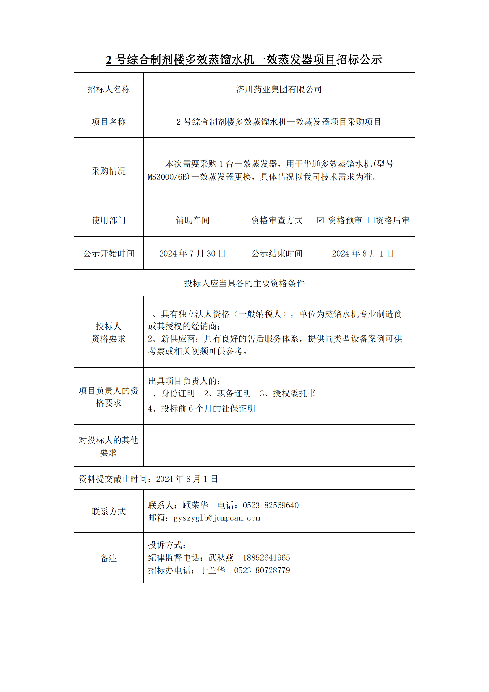 2号综合制剂楼多效蒸馏水机蒸发器项目招标公示