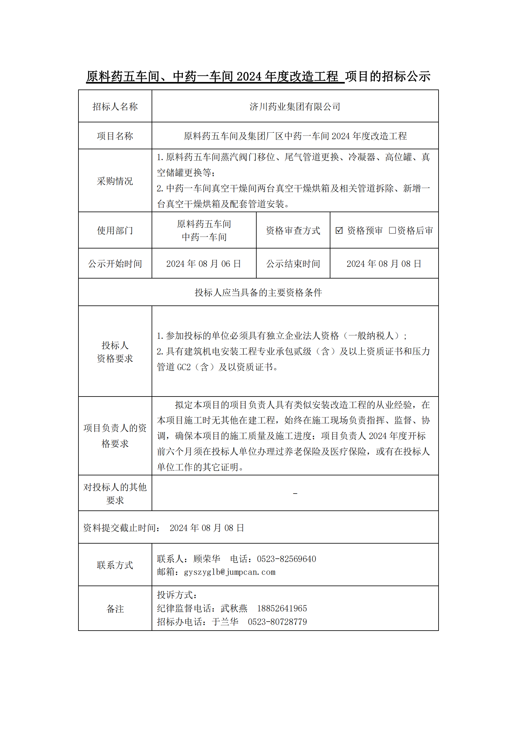 原料药基地一区原料药五车间及集团厂区中药一车间2024年度改造工程-项目招标公示