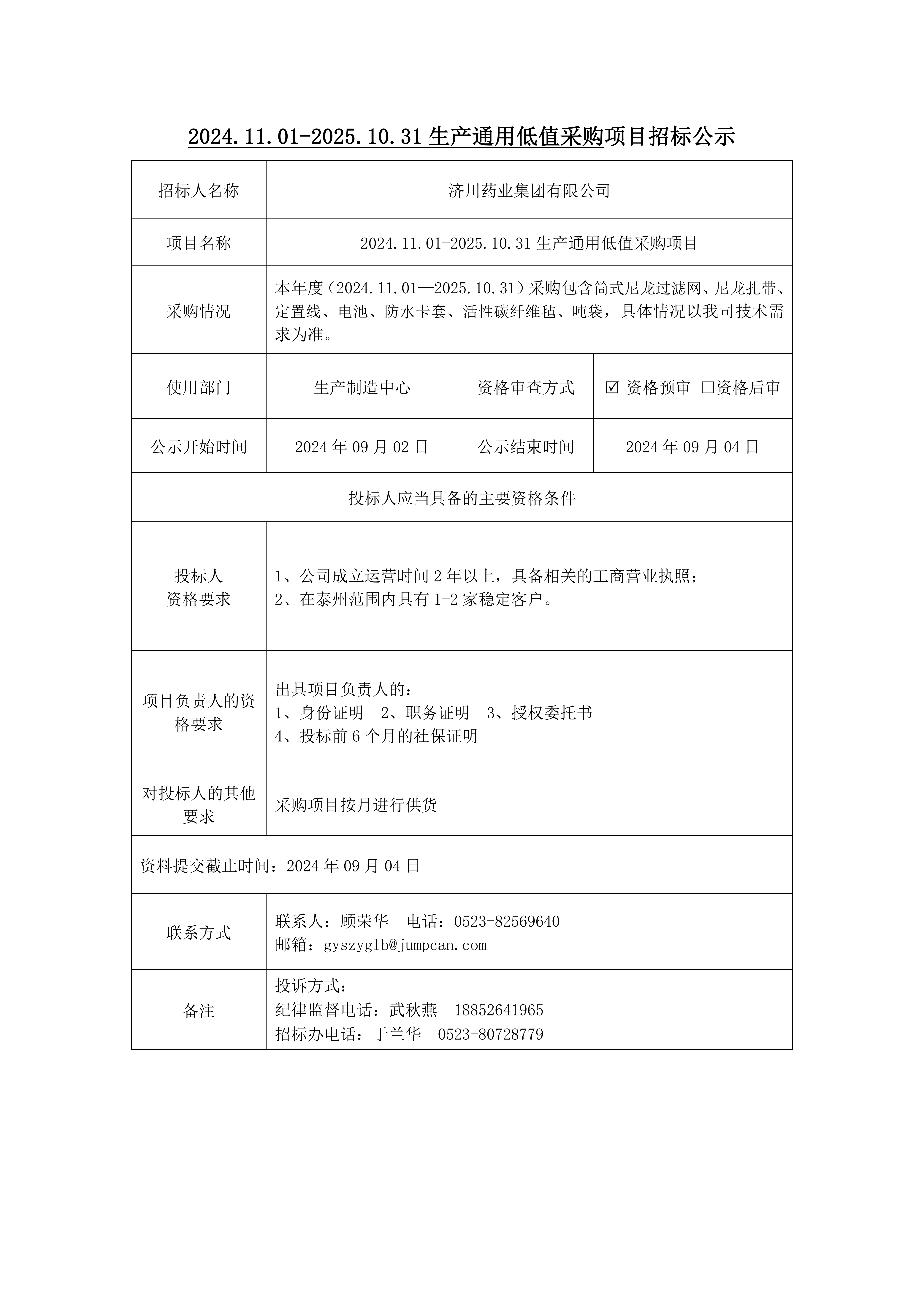 2024.11.01-2025.10.31生产通用低值采购项目招标公示