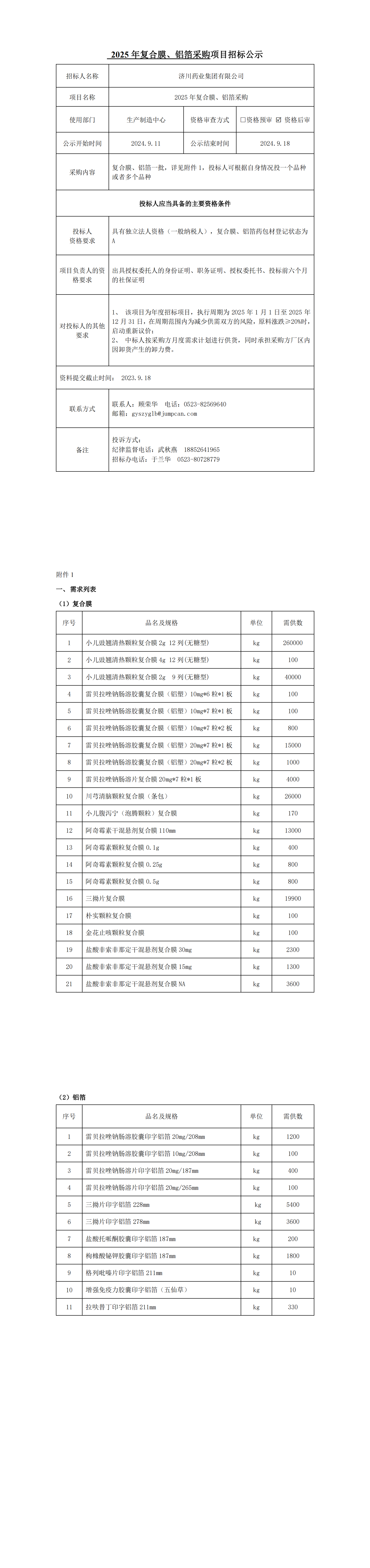 2025年复合膜、铝箔招标采购项目