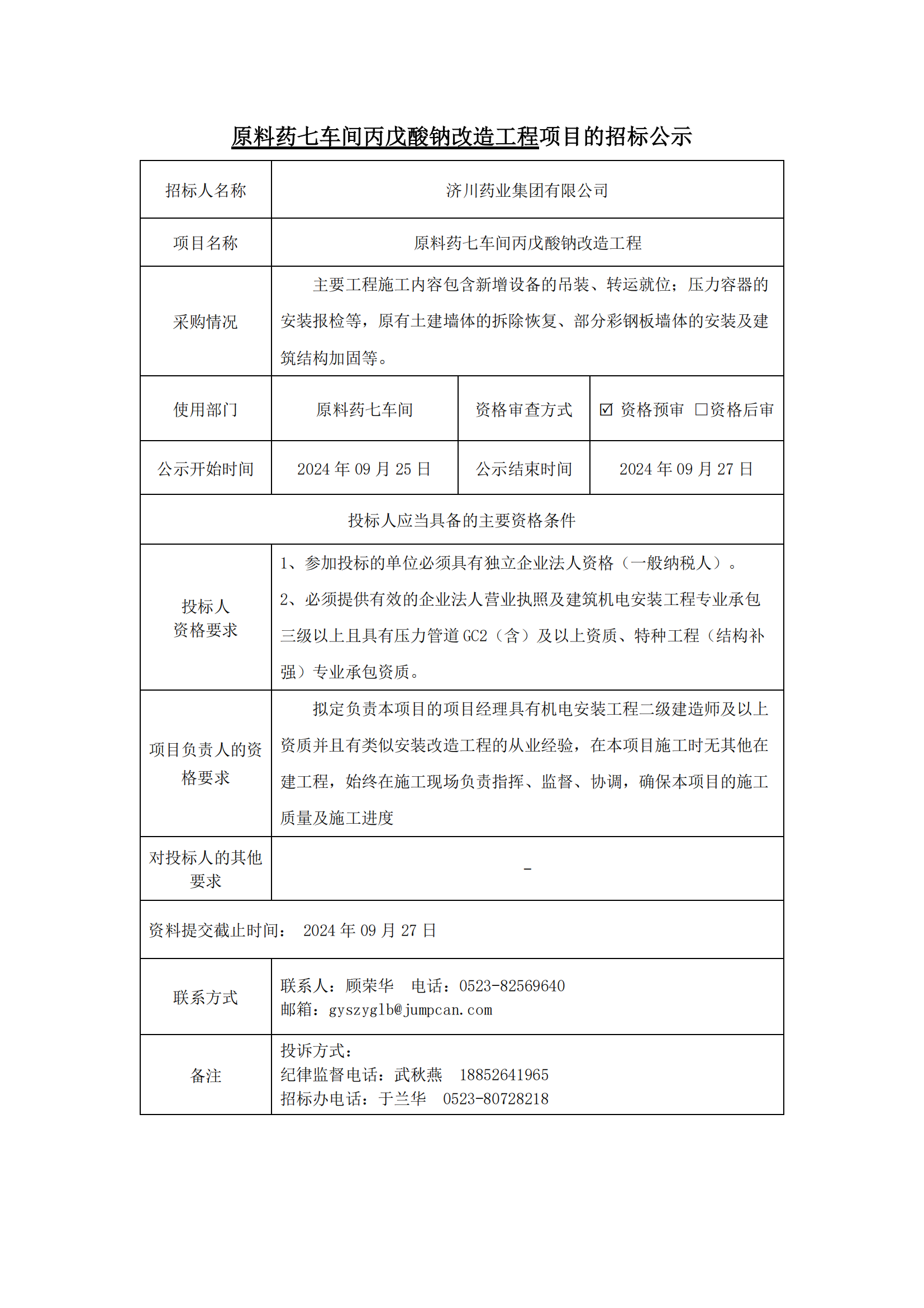 原料药七车间丙戊酸钠改造工程-招标公示