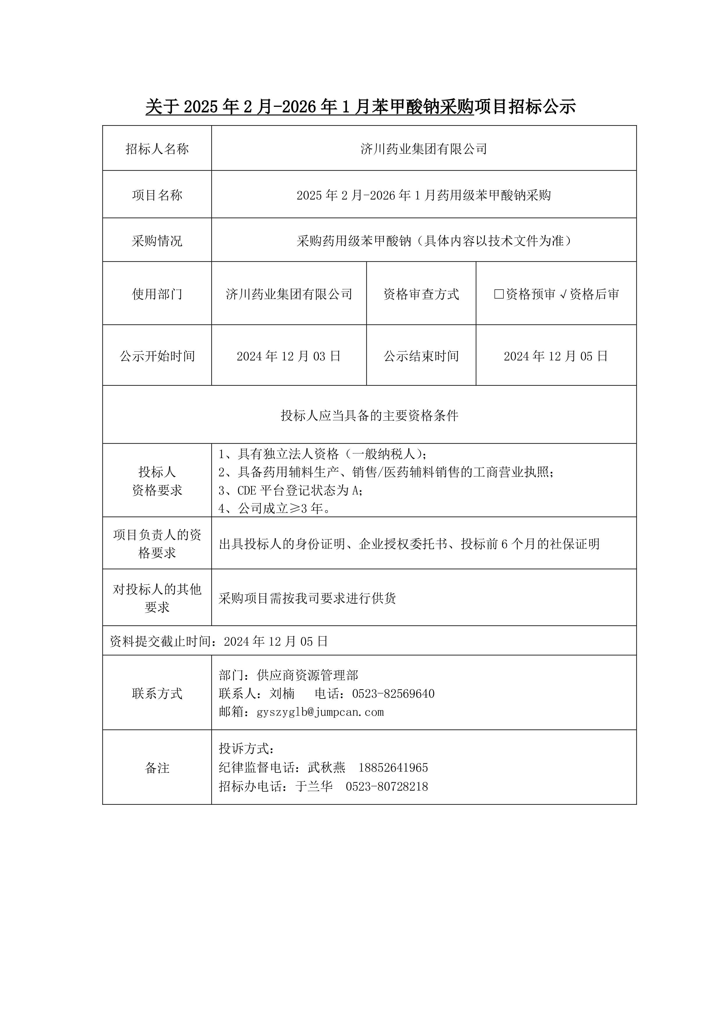 2025年2月-2026年1月苯甲酸钠采购项目招标公示