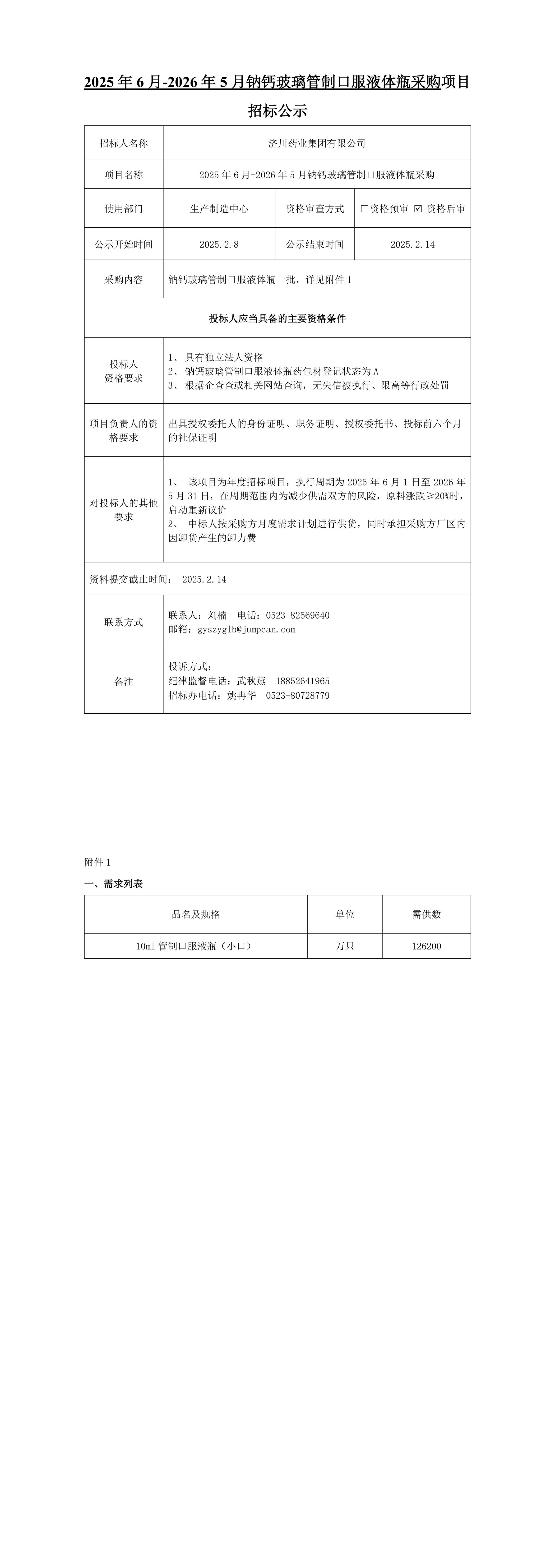 2025年6月-2026年5月钠钙玻璃管制口服液体瓶采购项目招标公示