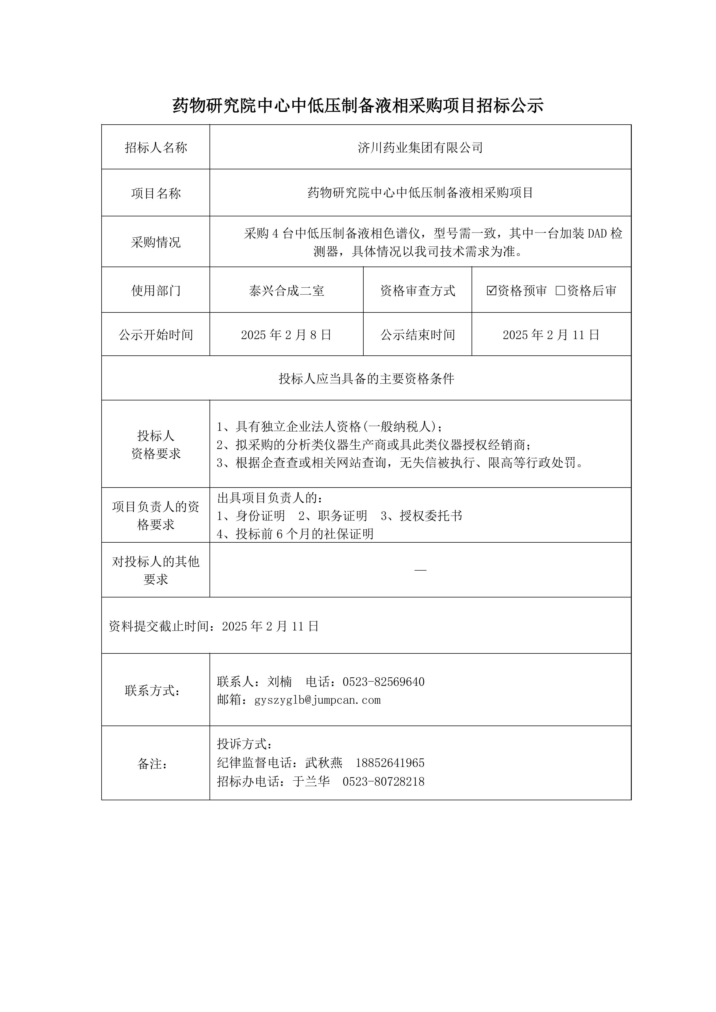 药物研究院中心中低压制备液相采购项目招标公示