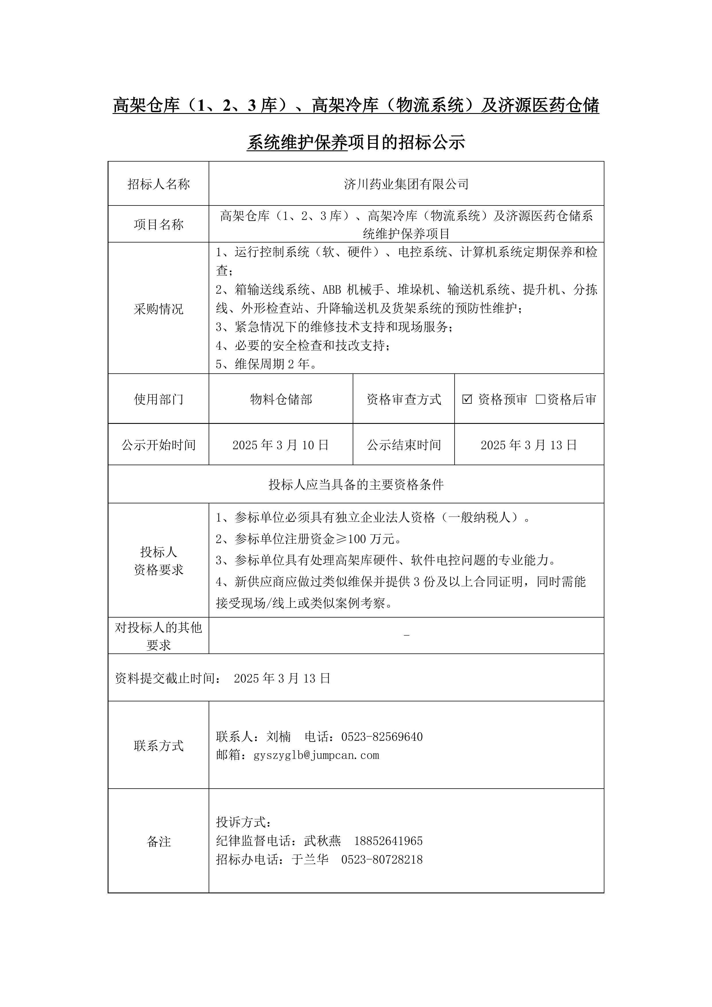 高架仓库(1、 2、 3库)、高架冷库(物流系统)及济源医药仓储系统维护保养项目的招标公示