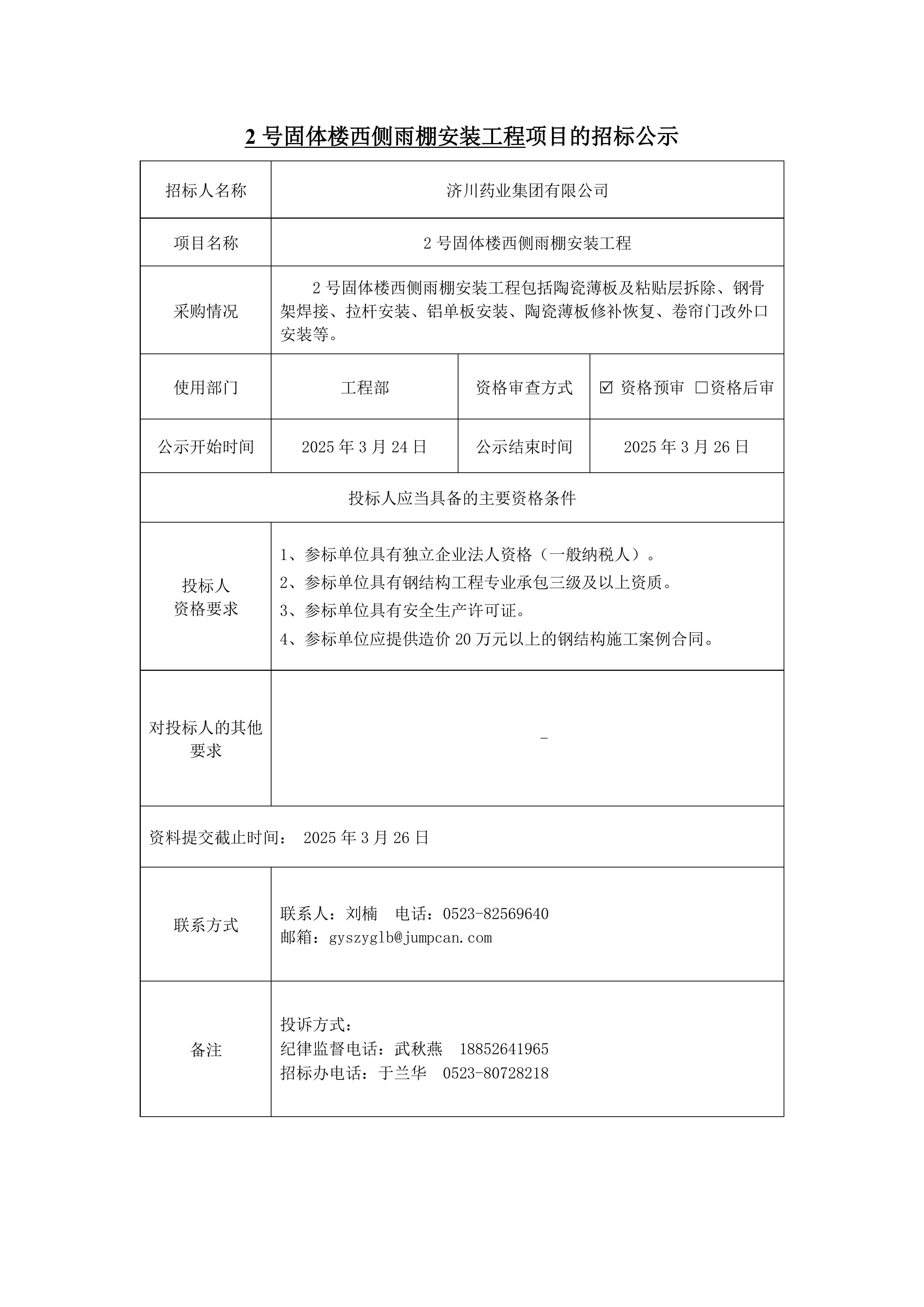 2号固体楼西侧雨棚安装工程项目的招标公示