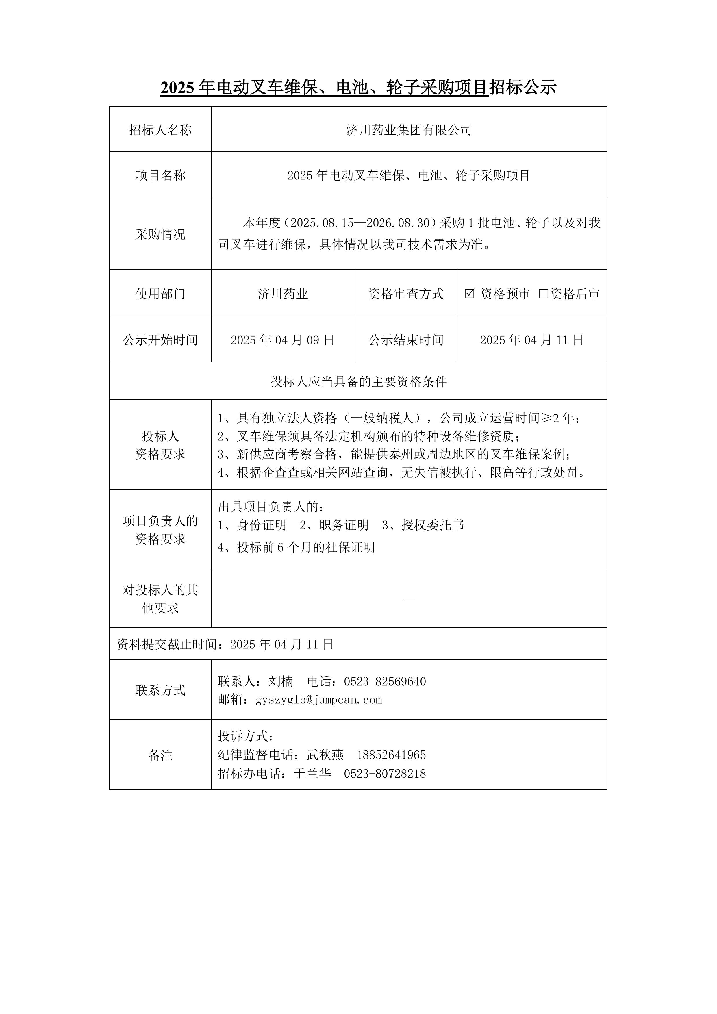 2025年电动叉车维保、电池、轮子采购项目招标公示