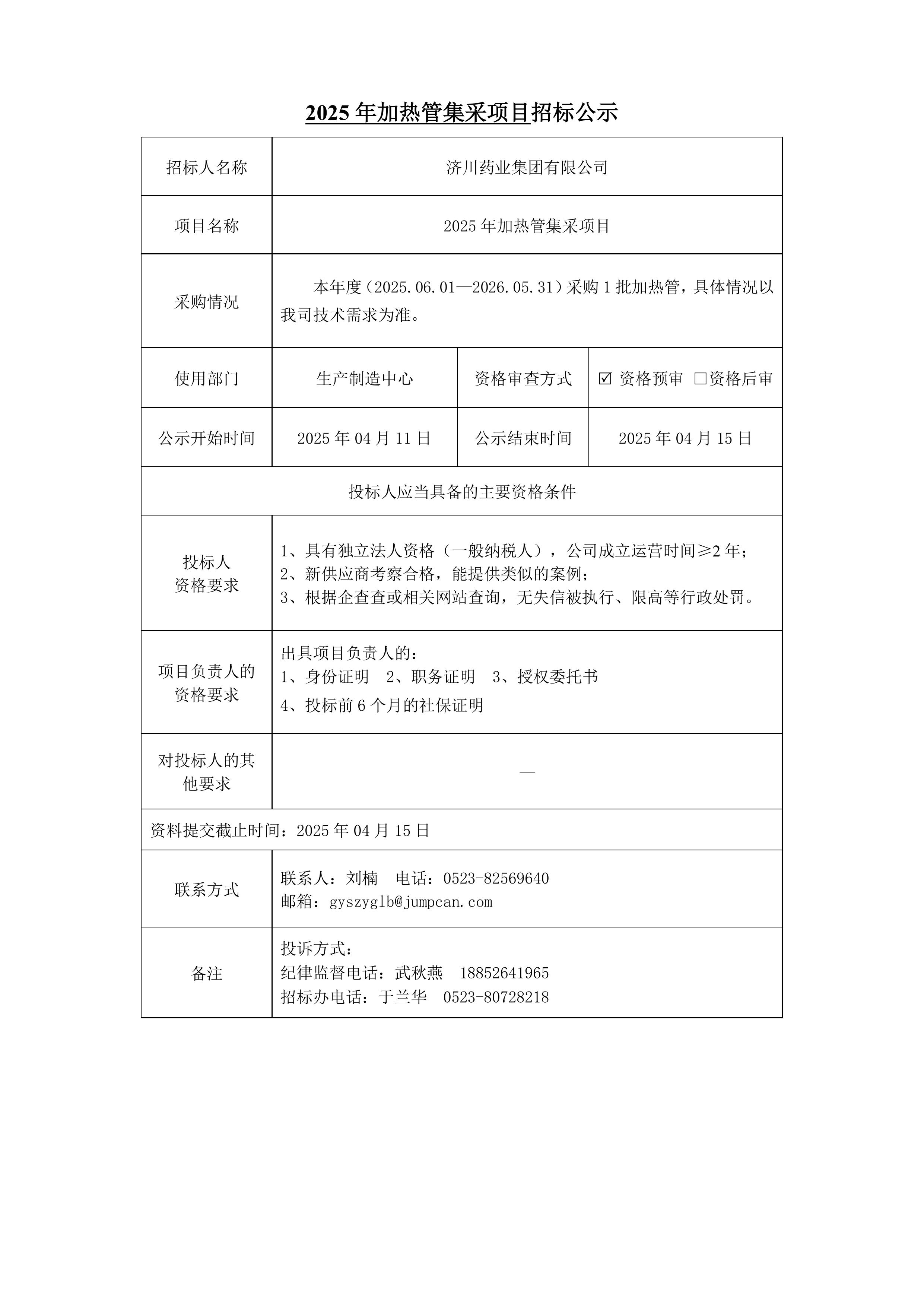 2025年加热管集采项目招标公示