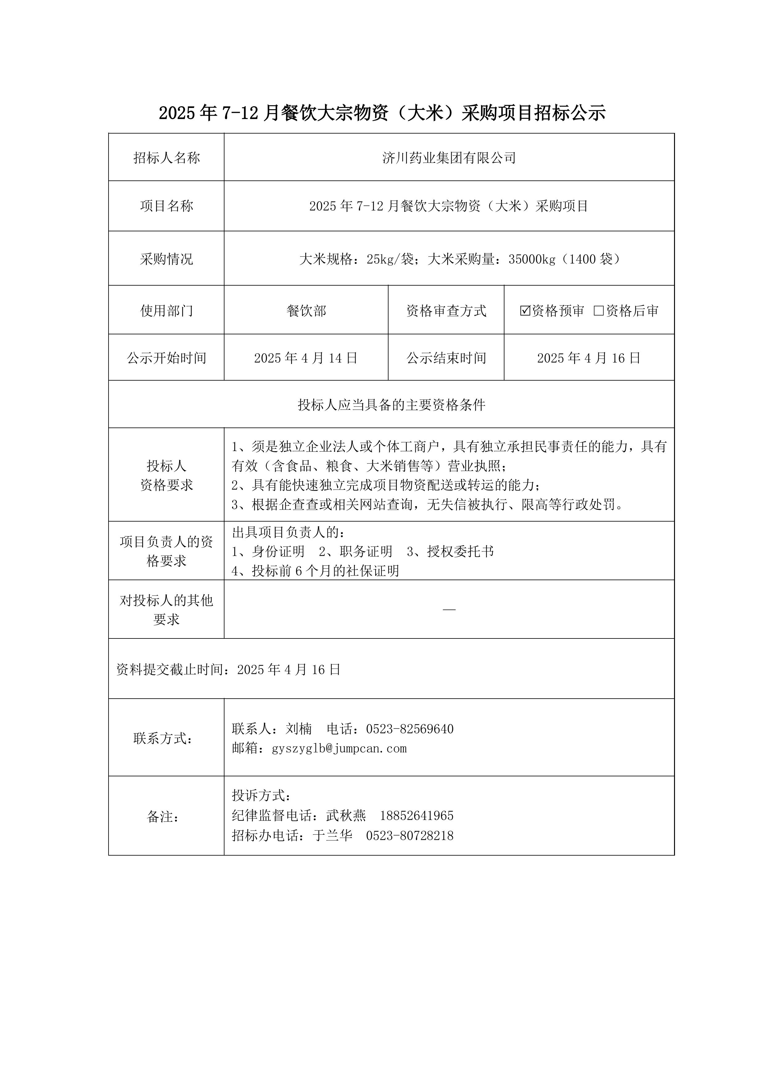 2025年7-12月餐饮大宗物资(大米)采购项目招标公示